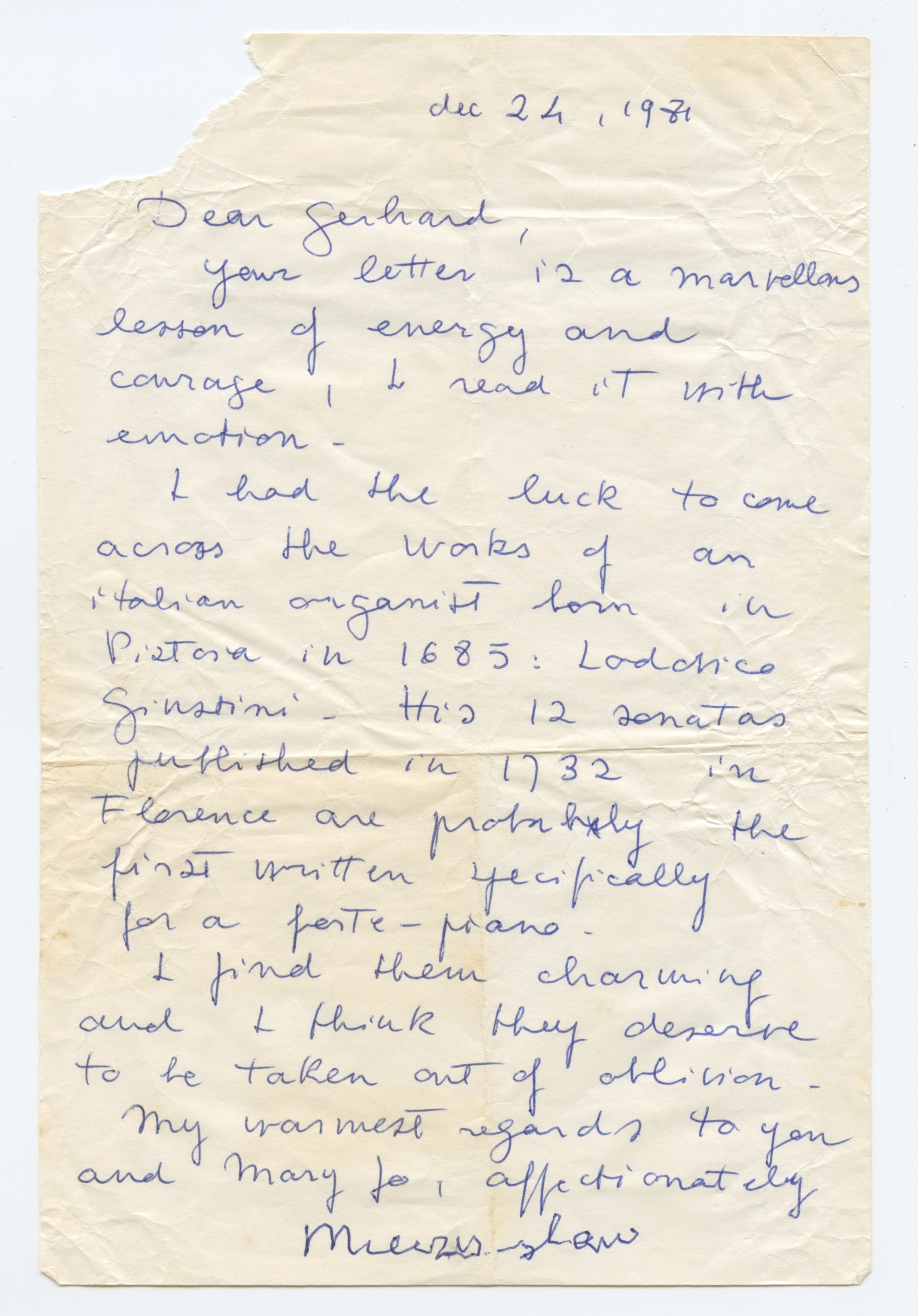 ALS (1 p., December 24, 1981) from Horszowski: "Your letter is a marvellous lesson of energy and courage! I read it with emotion!" and mentioning the Italian organist Lodvico Giustini. NB: This letter in the hand of his wife, signed by him.