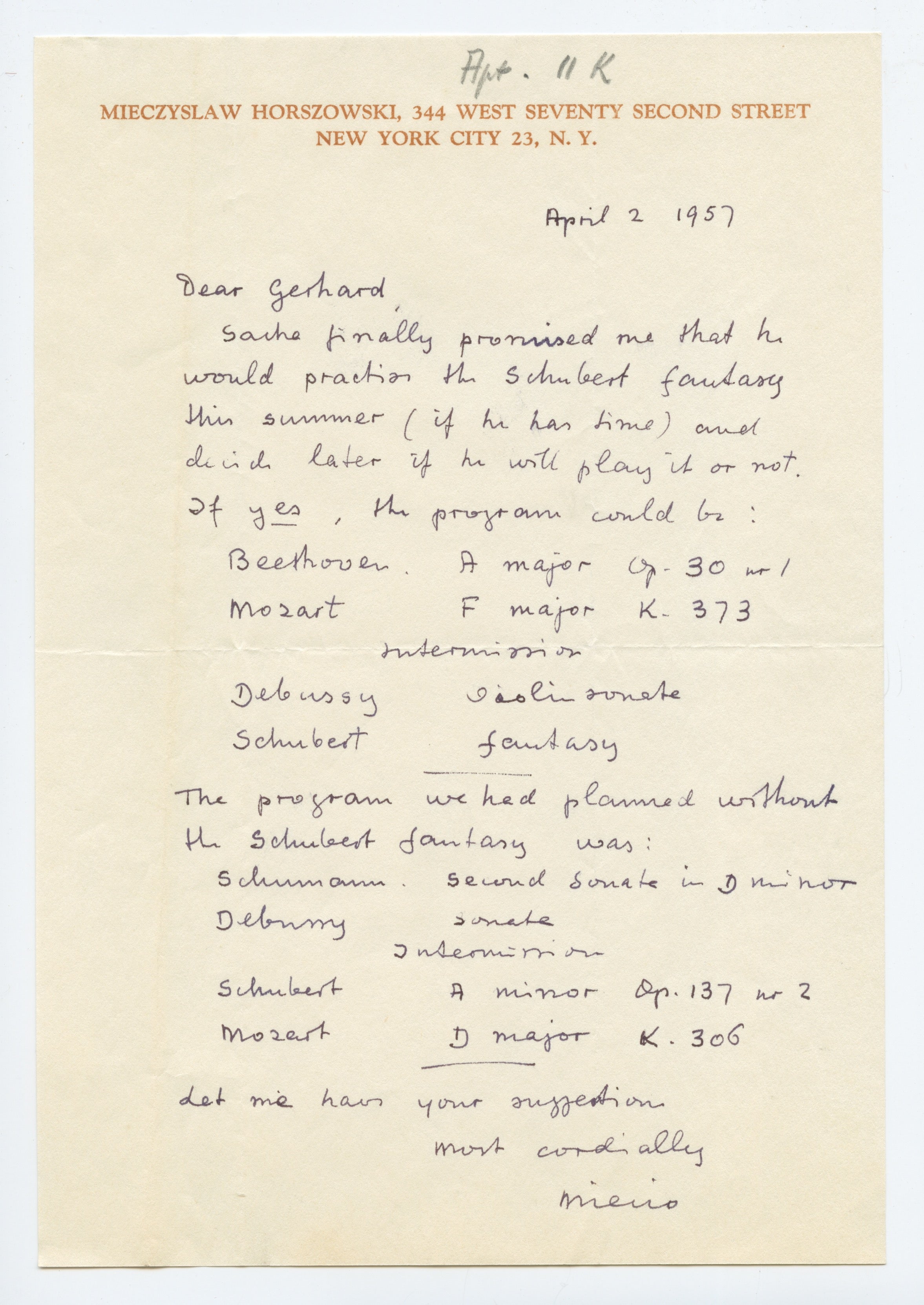 ALS (1 p., April 2, 1957) from Horszowski, suggesting two possible programs for the recital depending on whether Schneider plays the Fantasy.