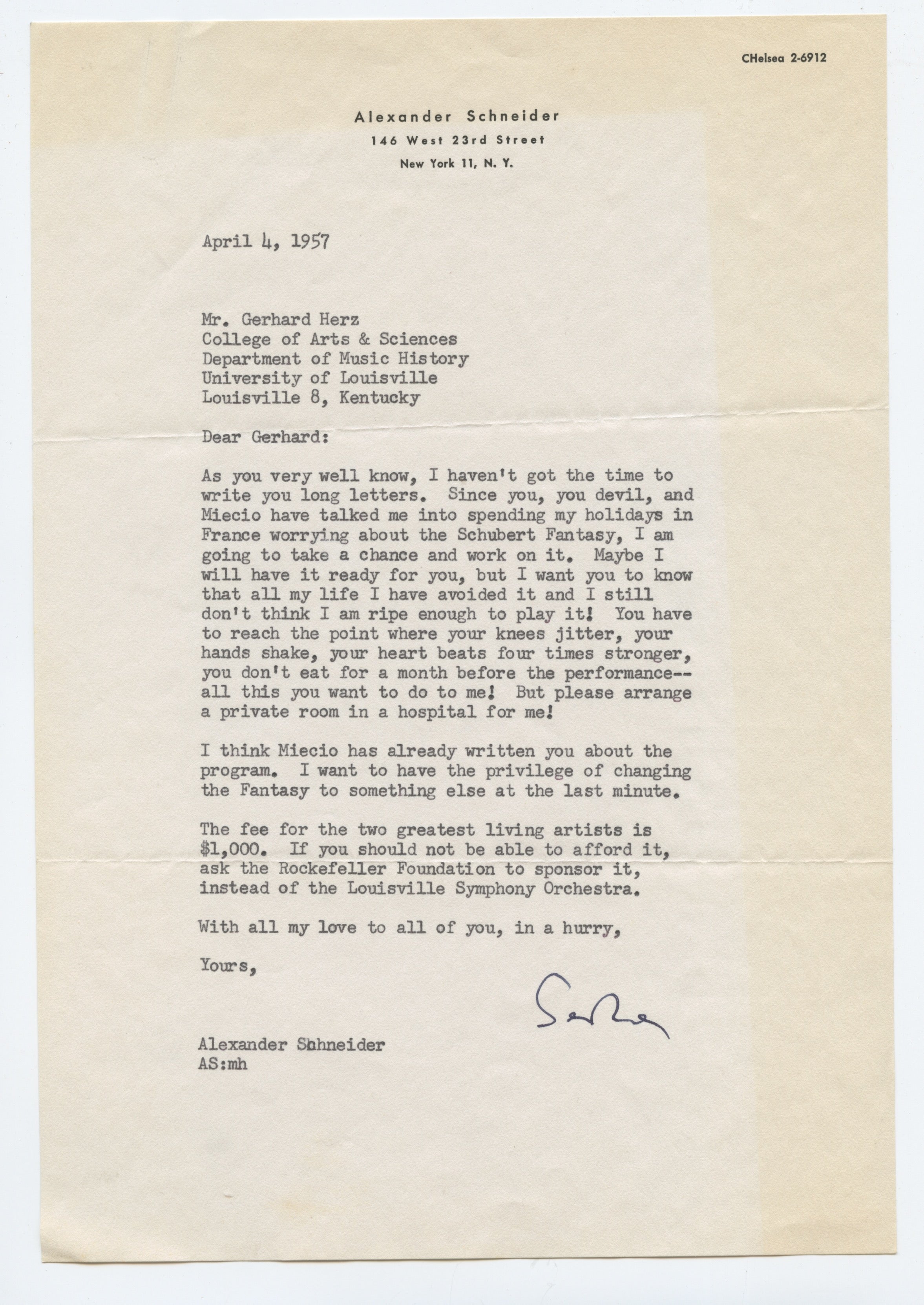 TLS (1 p., April 4, 1957) from Schneider, agreeing to "take a chance and work on" the Fantasy, but not promising as "I still don't think I am ripe enough to play it!" and declaring: "The fee for the two greatest living artists is $1,000."