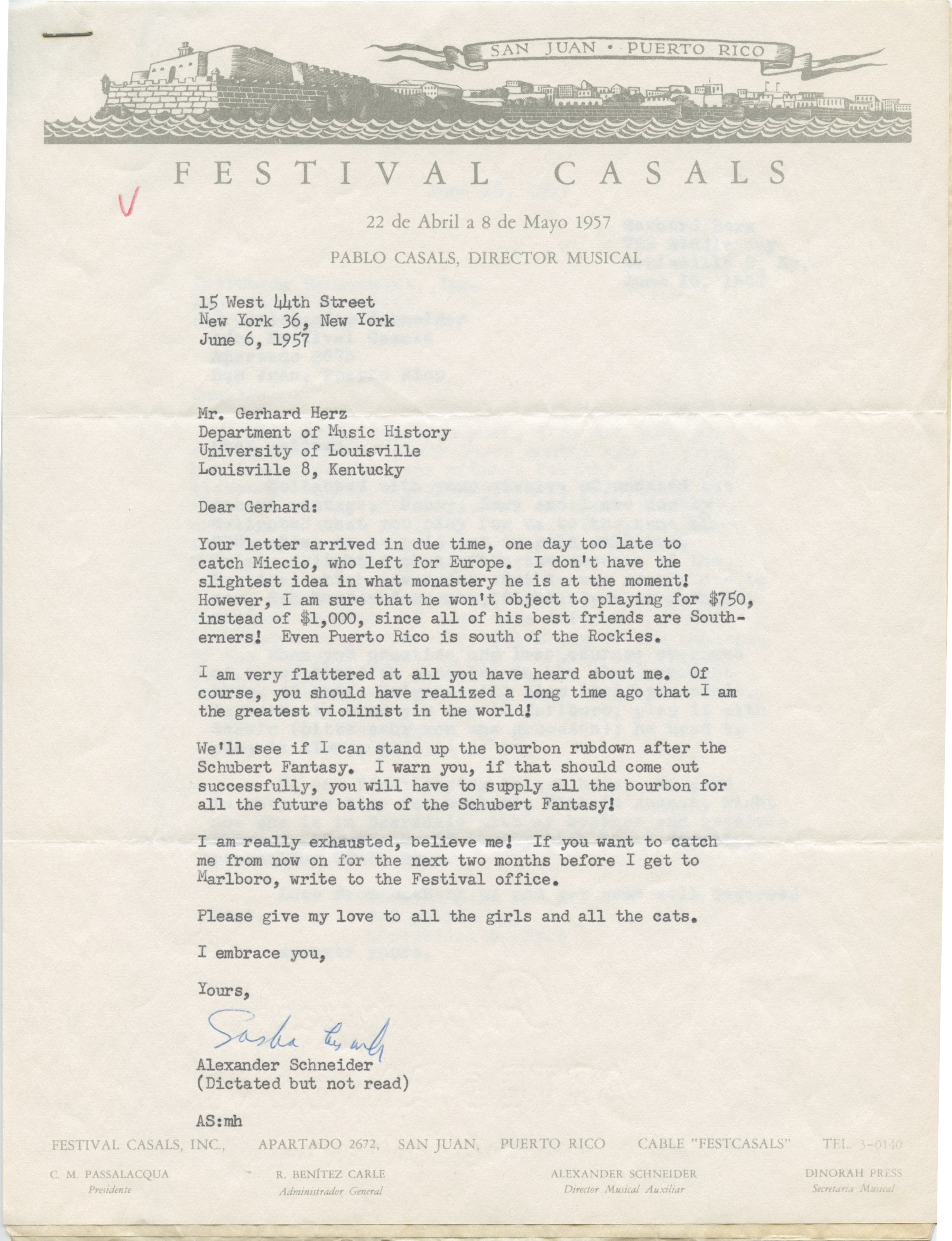 TLS (1 p., June 6, 1957) from Schneider on letterhead of the Casals Festival, agreeing to a fee of $750 and continuing: "We'll see if I can stand up the bourbon rubdown after the Schubert Fantasy. I warn you, if that should come out successfully, you will have to supply all the bourbon for all the future baths of the Schubert Fantasy!"