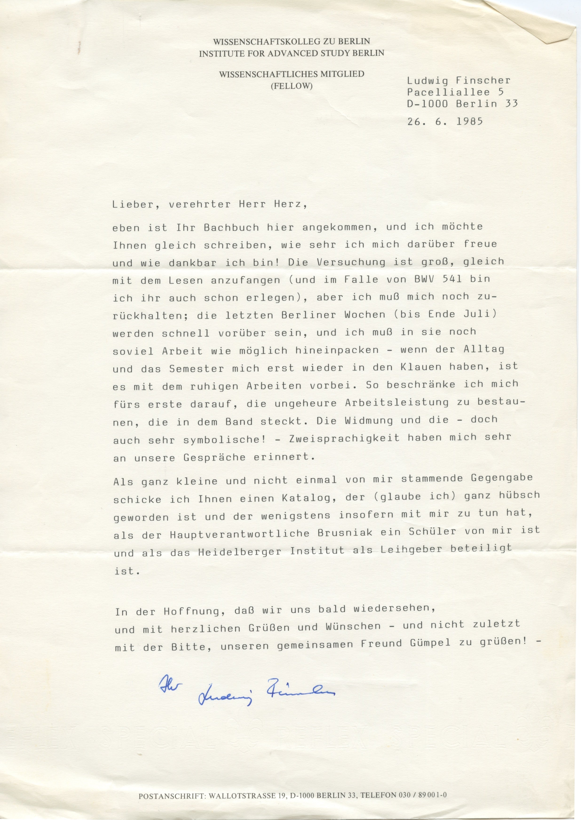 TLS (1 p., June 26, 1985) from musicologist Ludwig Finscher, thanking Herz for his published work on Bach sources.