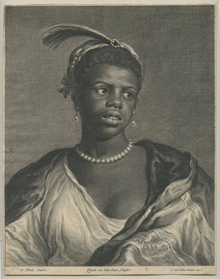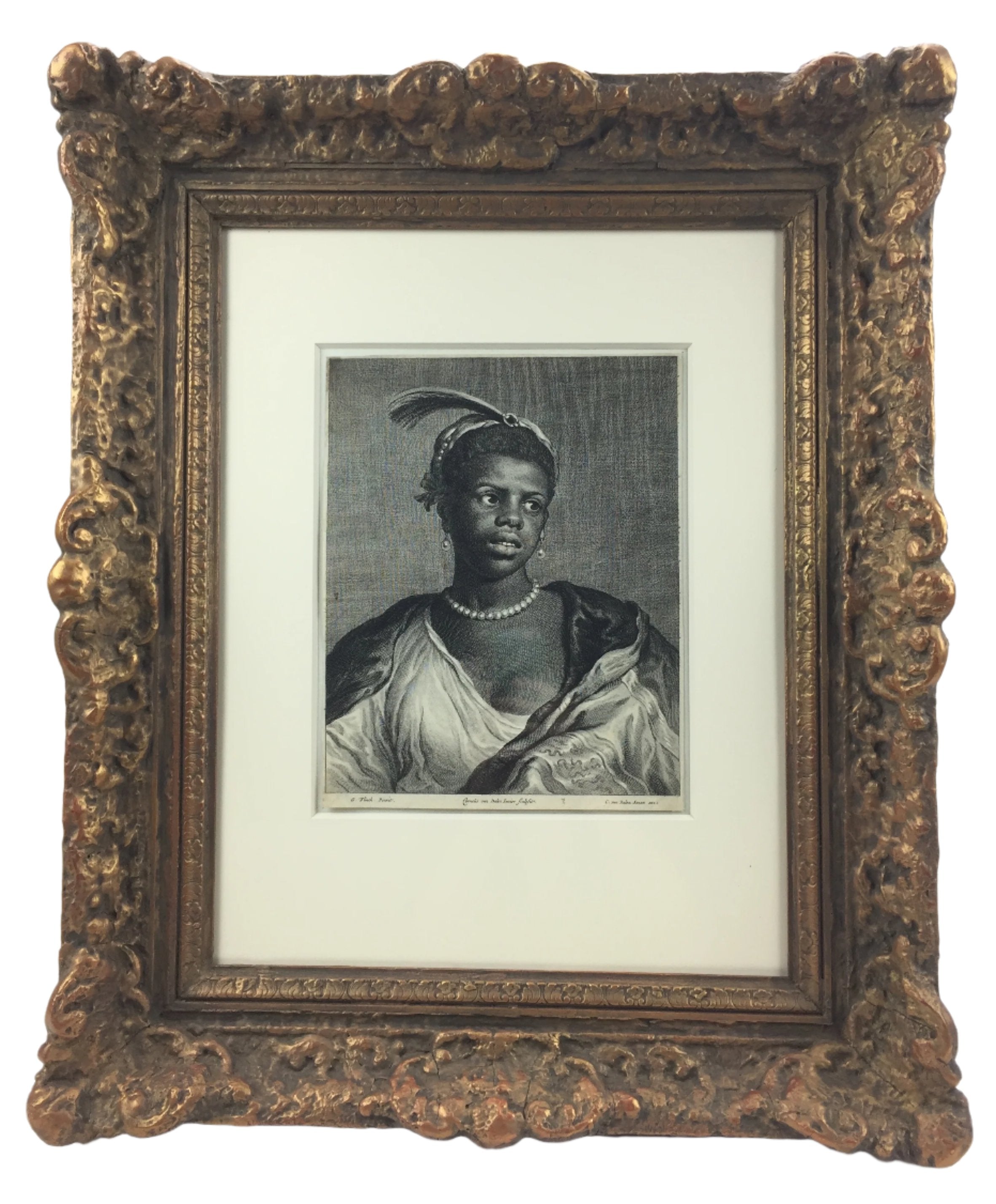 A young black woman, half length against a neutral background, wearing a feathered headdress and a pearl necklace with earrings. The first state (of two), engraved by Cornelis van Dalen the Younger after the painting by Govert Flinck, and published by Cornelis van Dalen the Elder, published before the addition of the Blooteling address. Small horizontal tear to the left edge, two unidentified collector's signs penned to the lower margin and upper left quadrant. Fine. 8 x 10.5 inches (21 x 26.4 cm), tipped to a larger sheet with some cataloging notes in pencil. Archivally framed in an ornate gold frame to an overall size of 18 x 23 inches. Hollstein 33 (I/II).