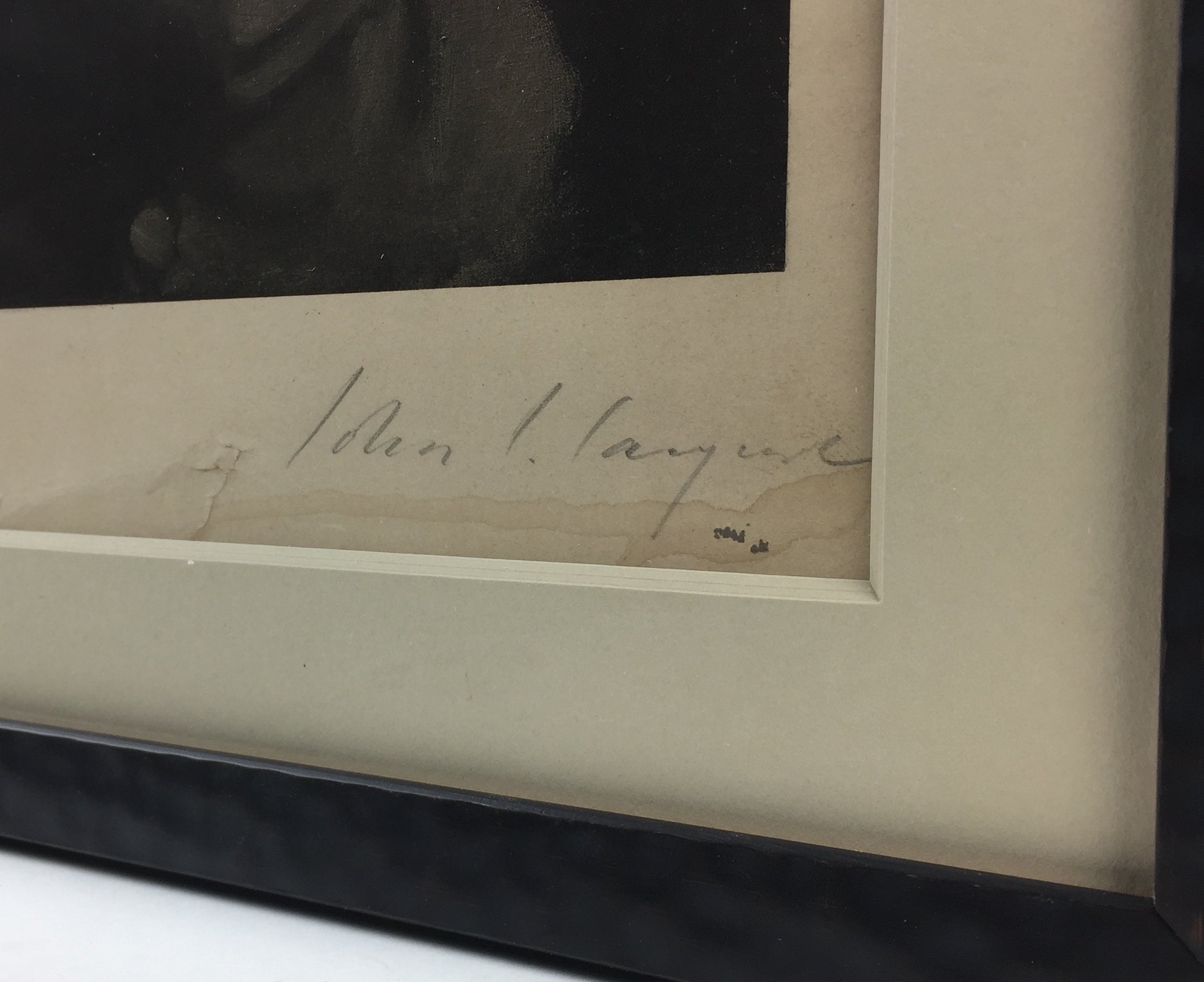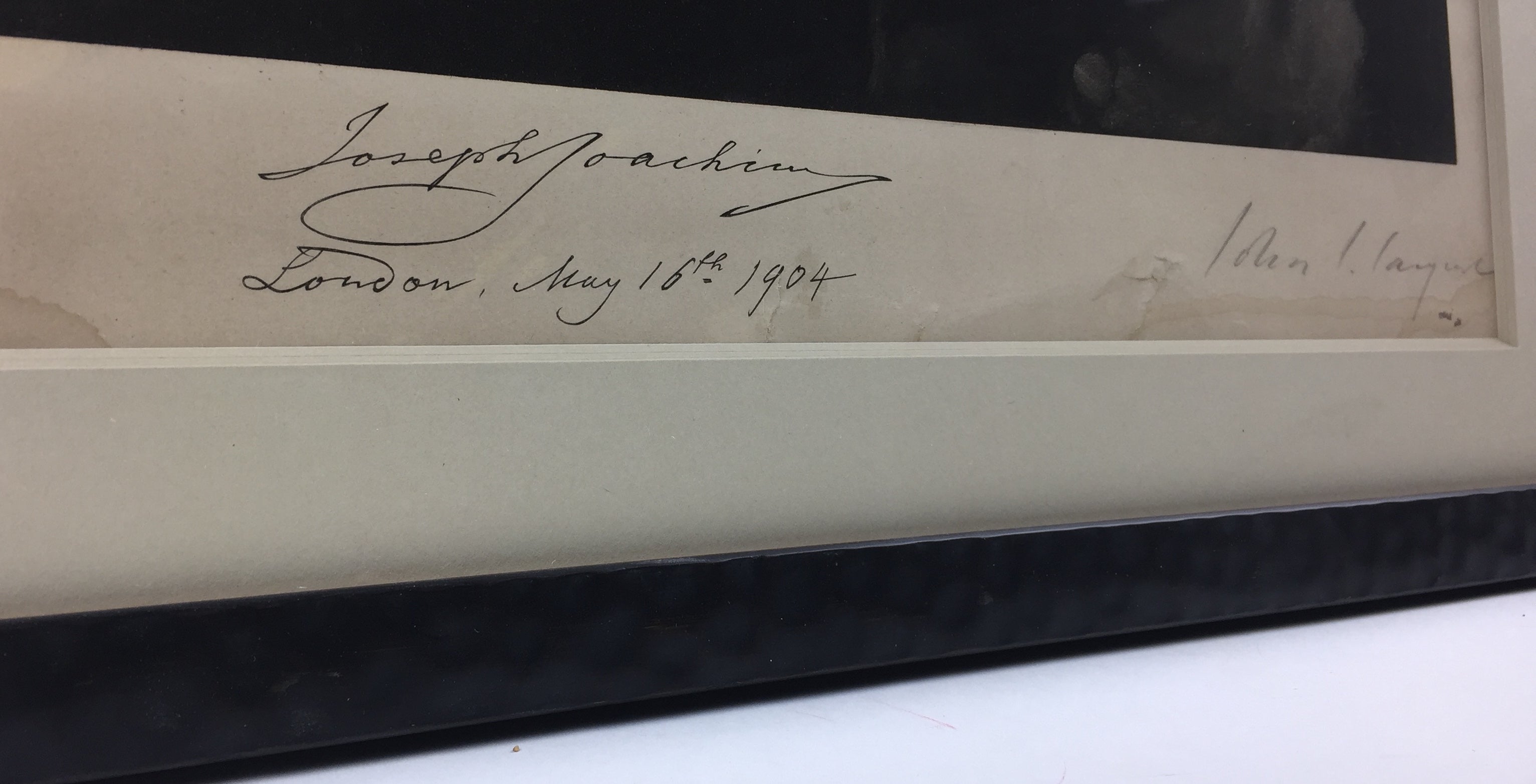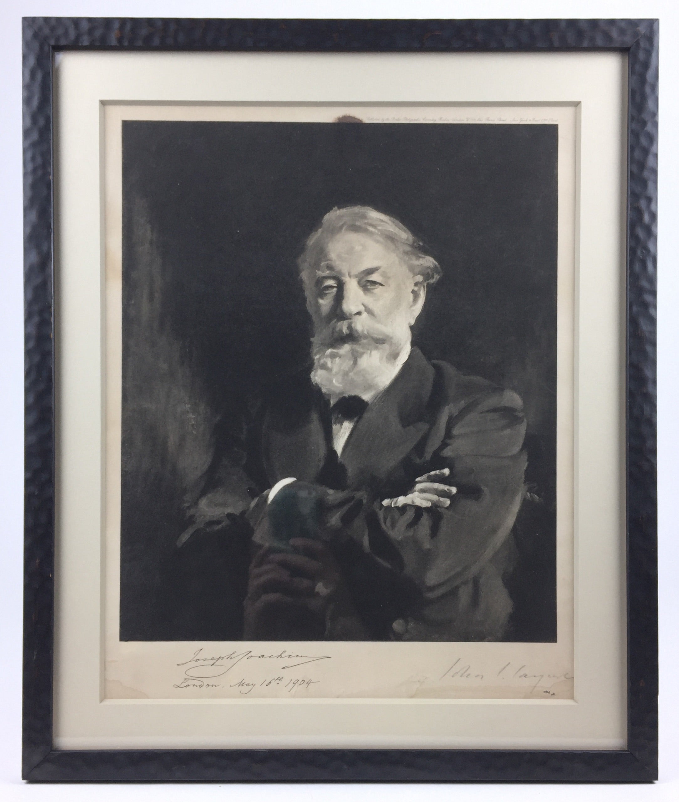 [Joachim, Joseph. (1831–1907)] Sargent, John Singer. (1856–1925) . Joseph Joachim - SIGNED LITHOGRAPH PORTRAIT. Remarkable original lithograph portrait of the great Hungarian violinist and Brahms collaborator, by the most successful portrait artist of his era. Printed on Chine-collé, signed in pencil by the artist on the lower right mount, bearing also the printed signature of the subject "Joseph Joachim / London, May 16th 1904." 15 1/4 x 13 1/4. Stains and chipping to the edges, mostly not affecting the portrait and slightly touching the edge of the signature. Nicely matted and framed to an overall size of 16 x 19.5 inches.