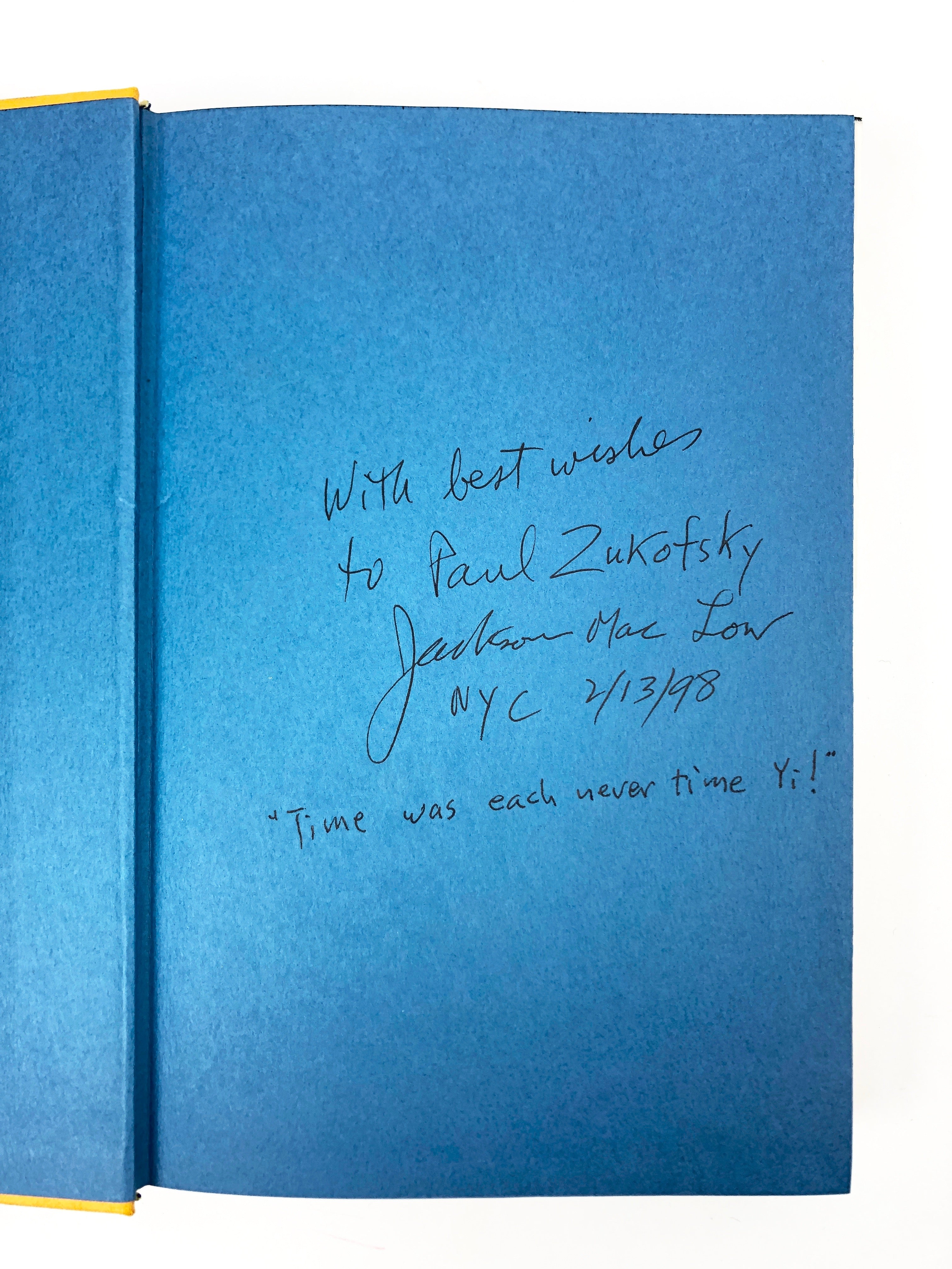 Signed and inscribed to violinist Paul Zukofsky on the front free endpaper: "With best wishes to Paul Zukofsky / Jackson Mac Low / NYC 2/13/98 / 'Time was each never time Yi!'." 424 pp. Hardcover, yellow cloth boards with pink dust jacket and further wrap-around sheet with a review from John Cage. This sheet partially torn, slight edge wear to dust jacket, otherwise very fine overall. 6.25 x 9.5 inches (16 x 24 cm).