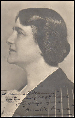Hess, Myra. (1890-1965). Signed Photograph from "Auntie Myra." . From the beloved English pianist, with an unusual family inscription: "To dearest 'Nannie' / With my best love / Always your 'Auntie Myra." 8 X 13 cm.