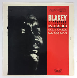 Blakey, Art. (1919–1990). Blakey in Paris - Cover Art Slick Proof. Original proof of the cover art for Art Blakey's 1961 hard bop album Blakey in Paris, from the collection of jazz photographer and cover designer Burt Goldblatt. Blakey is shown in a close-up photograph singing at the left, with text on a bold red background on the right. 14.5 x 15 inches (37 x 38 cm).