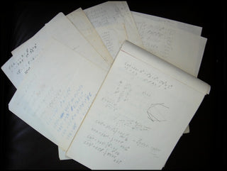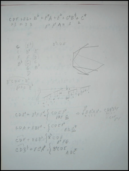 Hanson, Howard. (1896-1981). Autograph Manuscript, "Harmonic Materials of Modern Music." . A fascinating autograph manuscript, 37 handwritten pages, including revisions and corrections to his "Harmonic Materials of Modern Music: Resources of the Tempered Scale" (New York, 1960), described in Grove as "a seminal work in what would later be termed pitch-class set theory." The manuscript consists of numerous charts, lists of pitches and formulas of various kinds, completed mostly in pencil, with a few leaves in ink. Hanson apparently intended to publish this material in a new edition of the book which was never completed. One page of the notes includes ideas for a possible article or lecture, in part: "In saving the art we must be careful not to kill the child while rescuing it. Rock + Roll vs. Symphony. Turtle-neck sweaters. Professional vs. Amateur..."