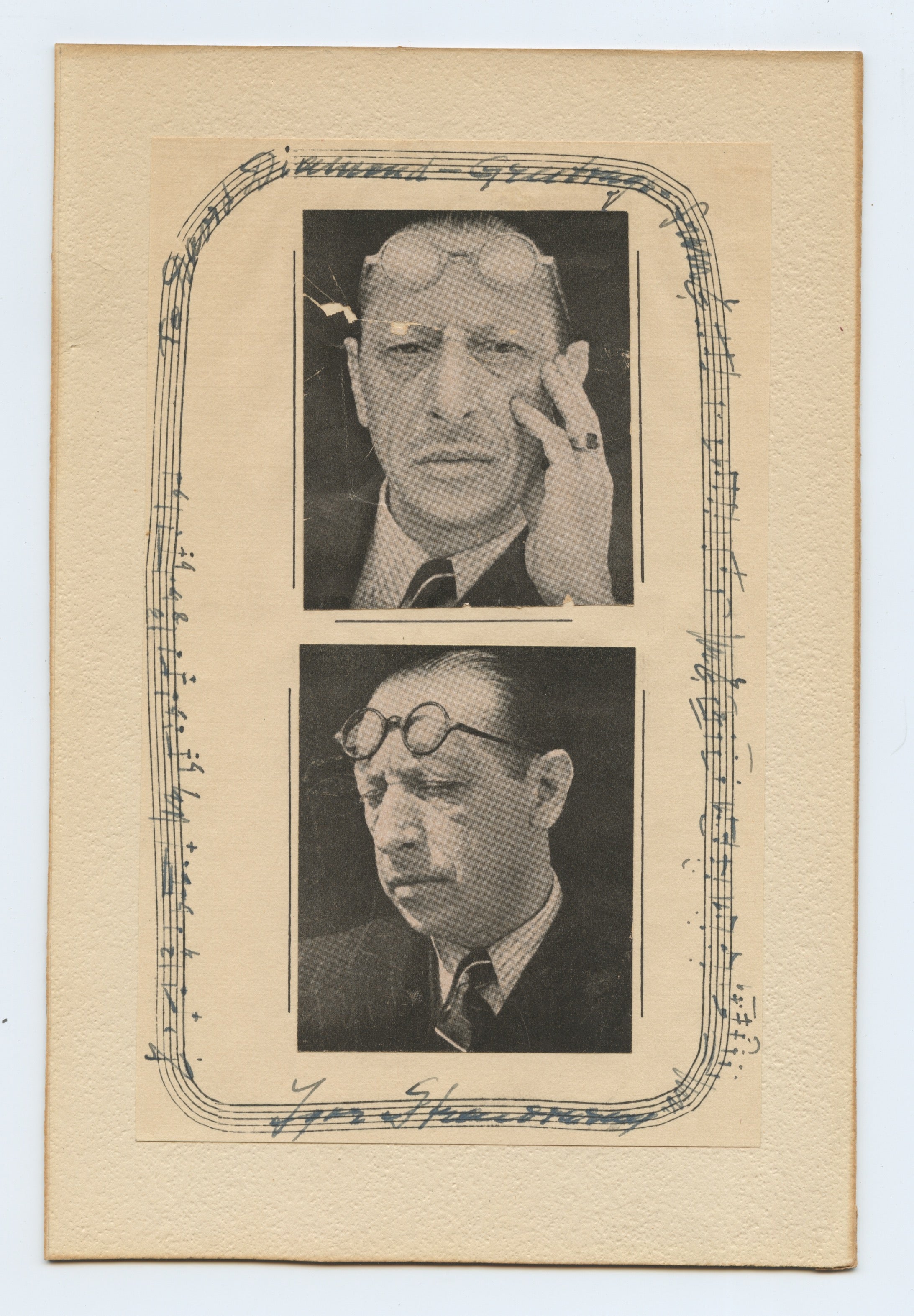 A remarkable composition of three autograph musical quotations from the important composer, penned in a circle around two clipped and mounted half-tone photographs, and signed and inscribed to American composer David Diamond. N.d. [August 1943]. Stravinsky has penned at the head: "To David Diamond—Greetings from" and at the foot: "Igor Stravinsky." Along the left edge, an autograph musical quotation of four measures in mixed meter from the first movement of the Concerto in E flat "Dumbarton Oaks" (1937–38); along the right edge, two further autograph musical quotations, one of two measures in 4/4 time and one of four measures in 2/4 time. On a sheet 5 x 8 inches (12.7 x 20.3 cm), tipped to a larger card mount of 6.5 x 9.75 inches (16.4 x 24.5 cm). Together with a sheet from the backing of an earlier framed presentation, which dates the inscription to August 1943. Light toning; upper photograph partially torn; otherwise fine overall.