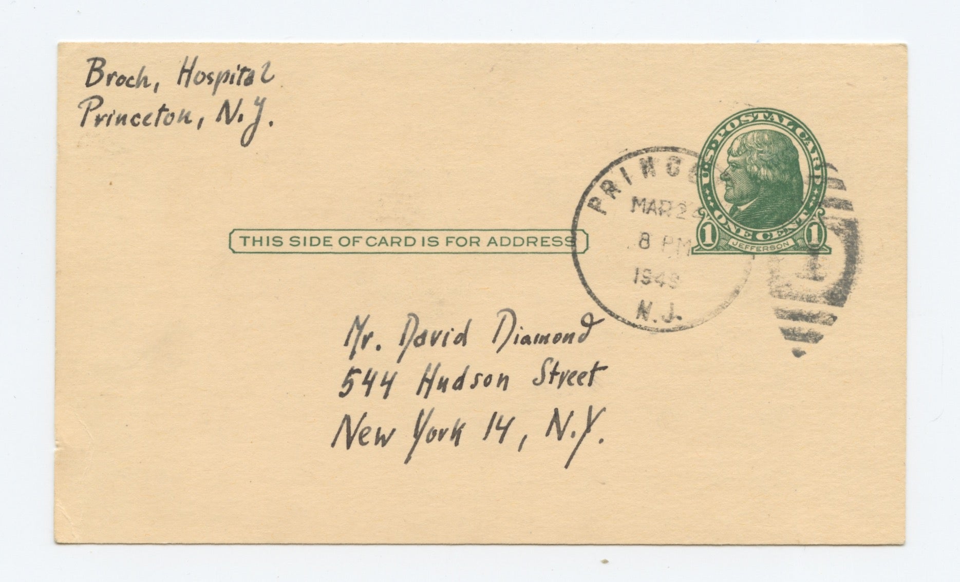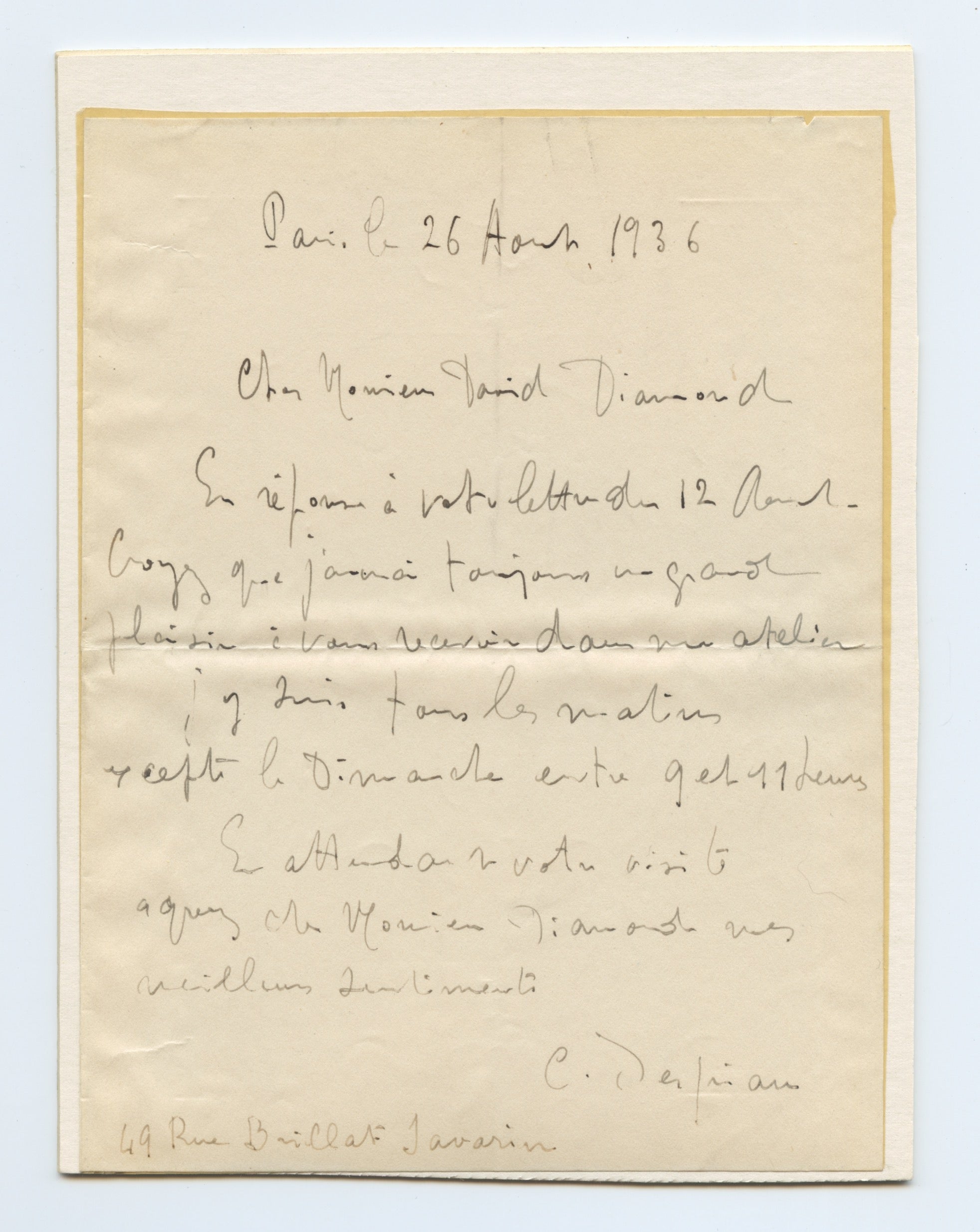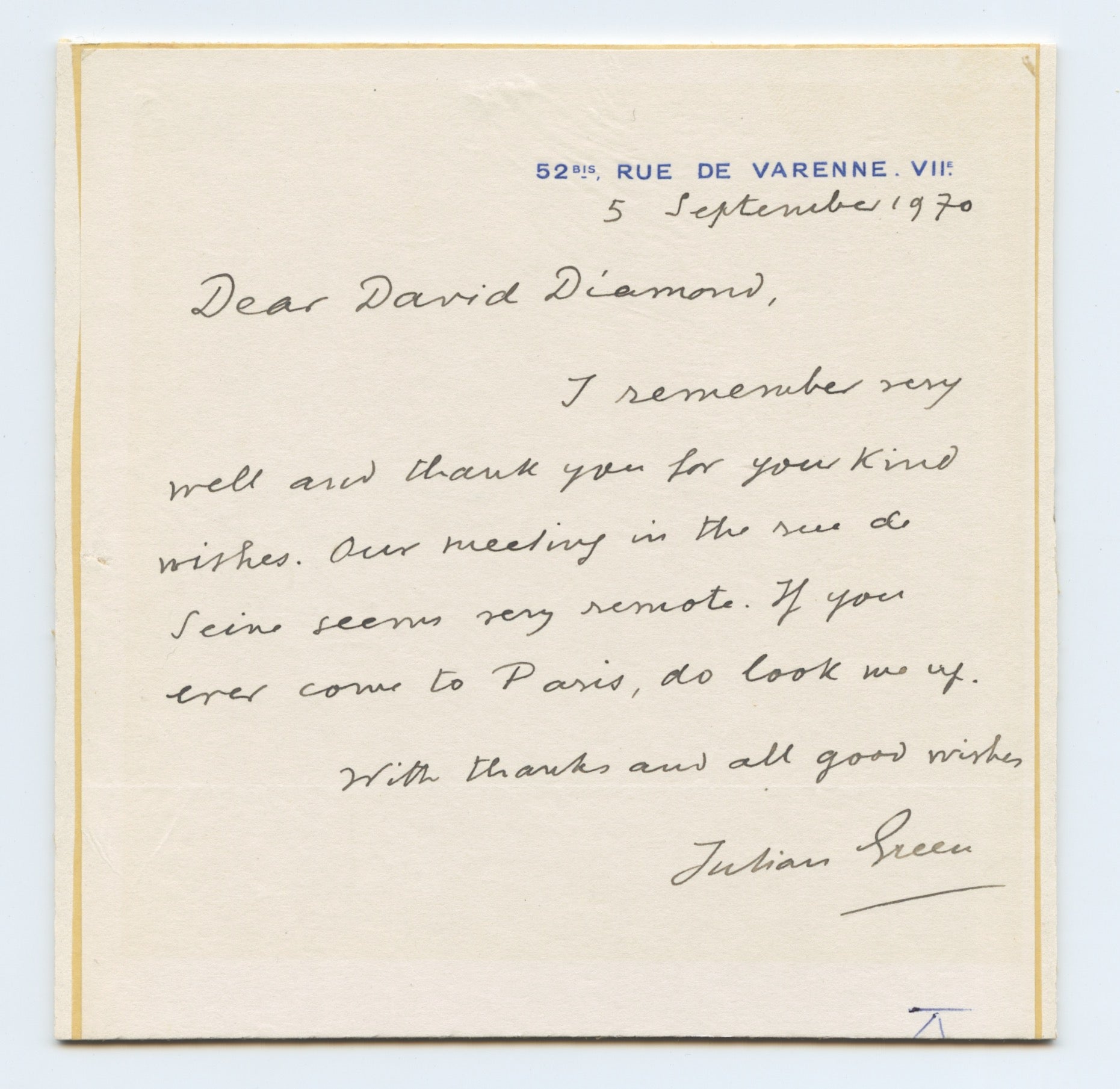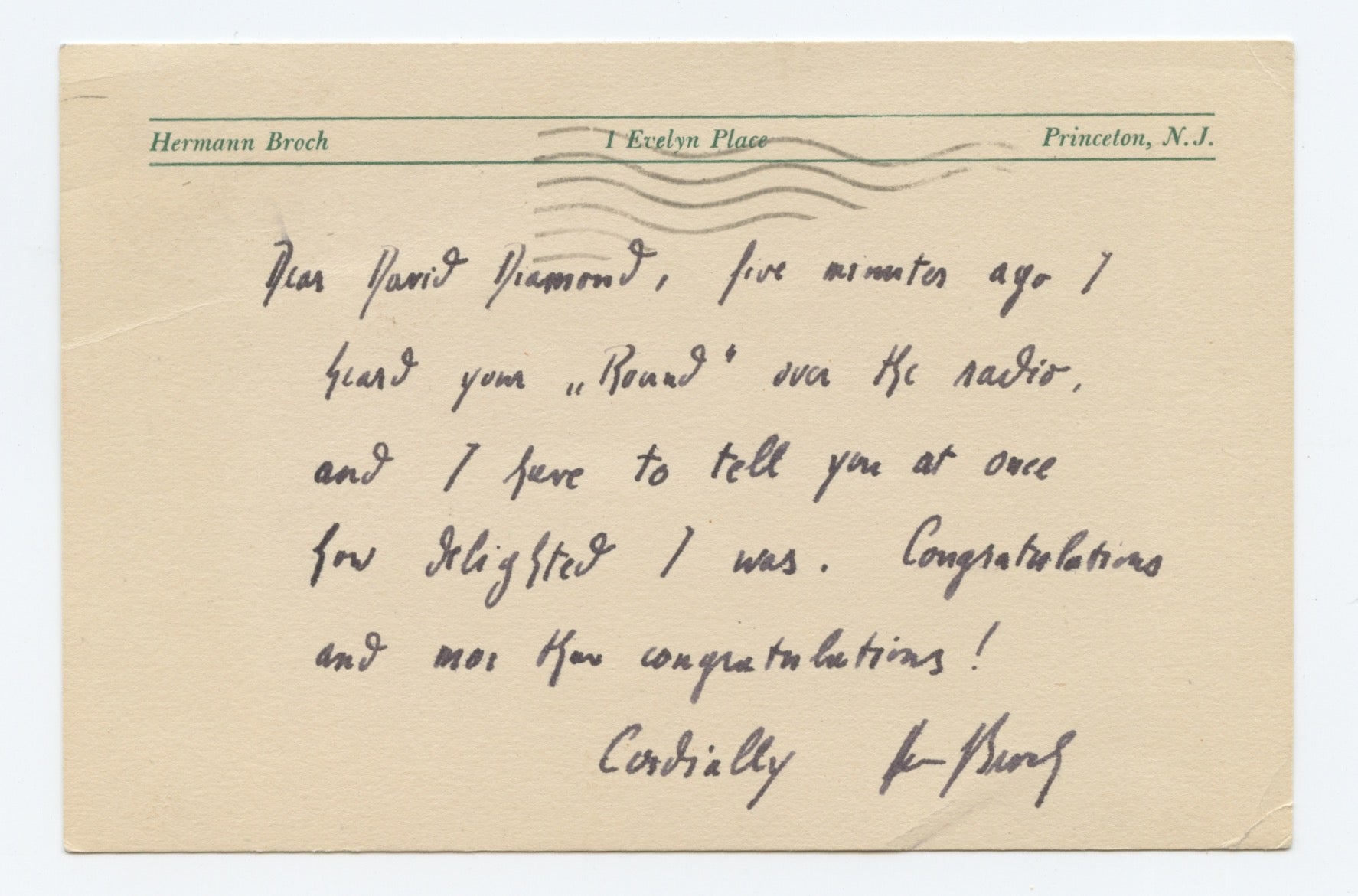 [Diamond, David. (1915–2005)] Despiau, Charles. (1874–1946) & Agee, James. (1909–1955) & Broch, Hermann. (1886–1951) & Green, Julien. (1900–1998) . Collection of Letters to David Diamond. An interesting group of autograph letters signed, addressed to American composer David Diamond. Included are letters from: French sculptor Charles Despiau (Paris, August 1, 1936, 1 p., a short letter in French agreeing to meet Diamond at his atélier in Paris; with a half-tone photograph of the artist); American writer James Agee (New York, April 21, 1950, 1 p., reacting positively to a setting of one of his poems by Diamond: "Wow! That had never occurred to me as settable but [...] seems a damn good idea. I wish I could hear it" and offering several small corrections to the text of a poem; together with a clipped halftone photograph); Austrian writer Hermann Broch (3 autograph postcards, December 19, 1945, October 21, 1946, and March 24, 1949; Broch compliments Diamond on his works "Round" and "The Tempest," and reports on his hip surgery; together with a 5 x 7 photograph of Broch ca. 1945); and American writer Julien Green (Paris, September 5, 1970, 1 p; inviting Diamond to look him up in Paris; together with a half-tone photograph). Also included are a brief typed note signed to Henri Prunières from an unidentified writer, introducing Diamond (Gstaad, June 25, n.y.; with envelope); and an autograph note signed from "Harper" on a postcard photograph showing Diamond posing with a female friend and a large painting (Summer [19]50, 1 p.).
