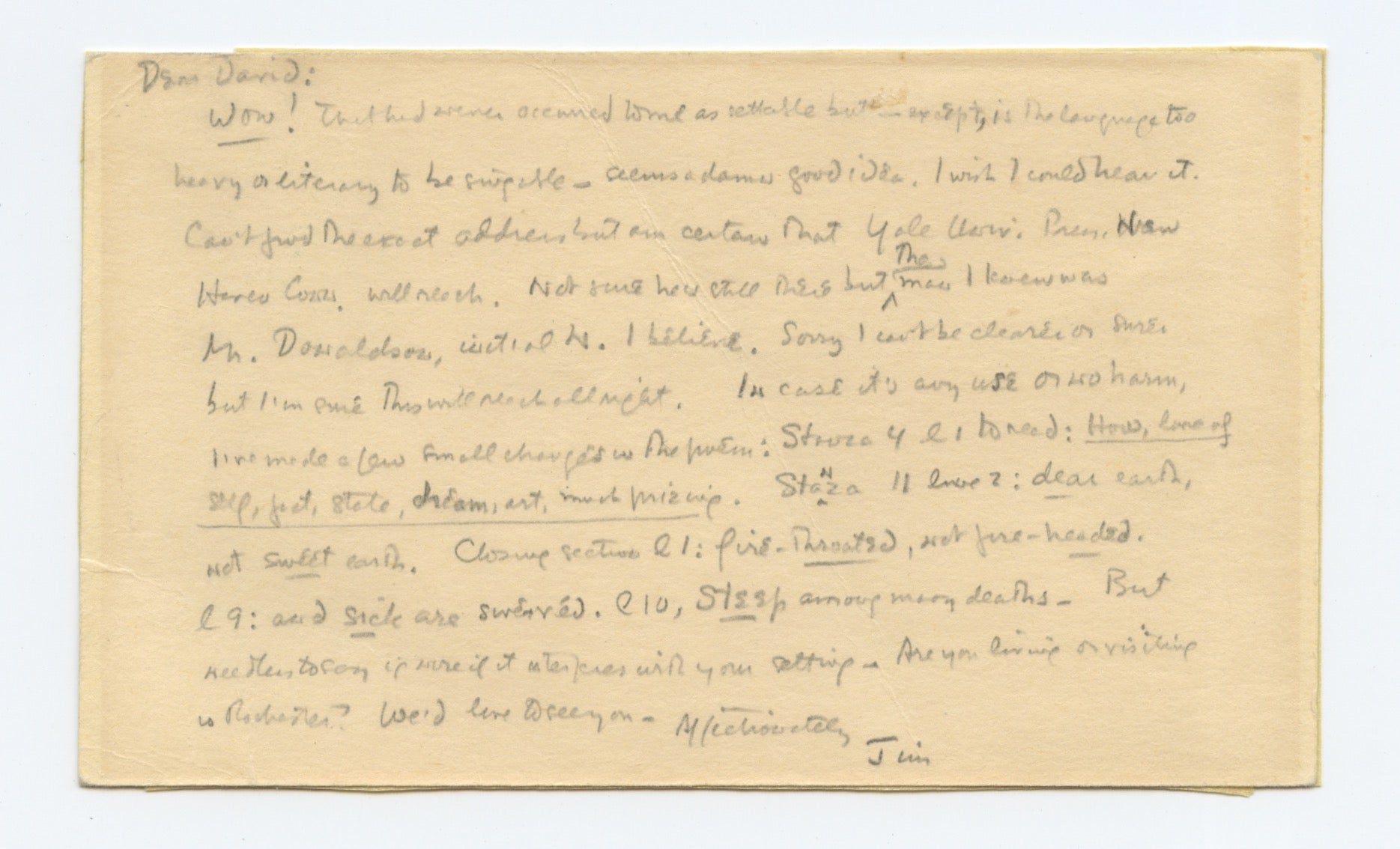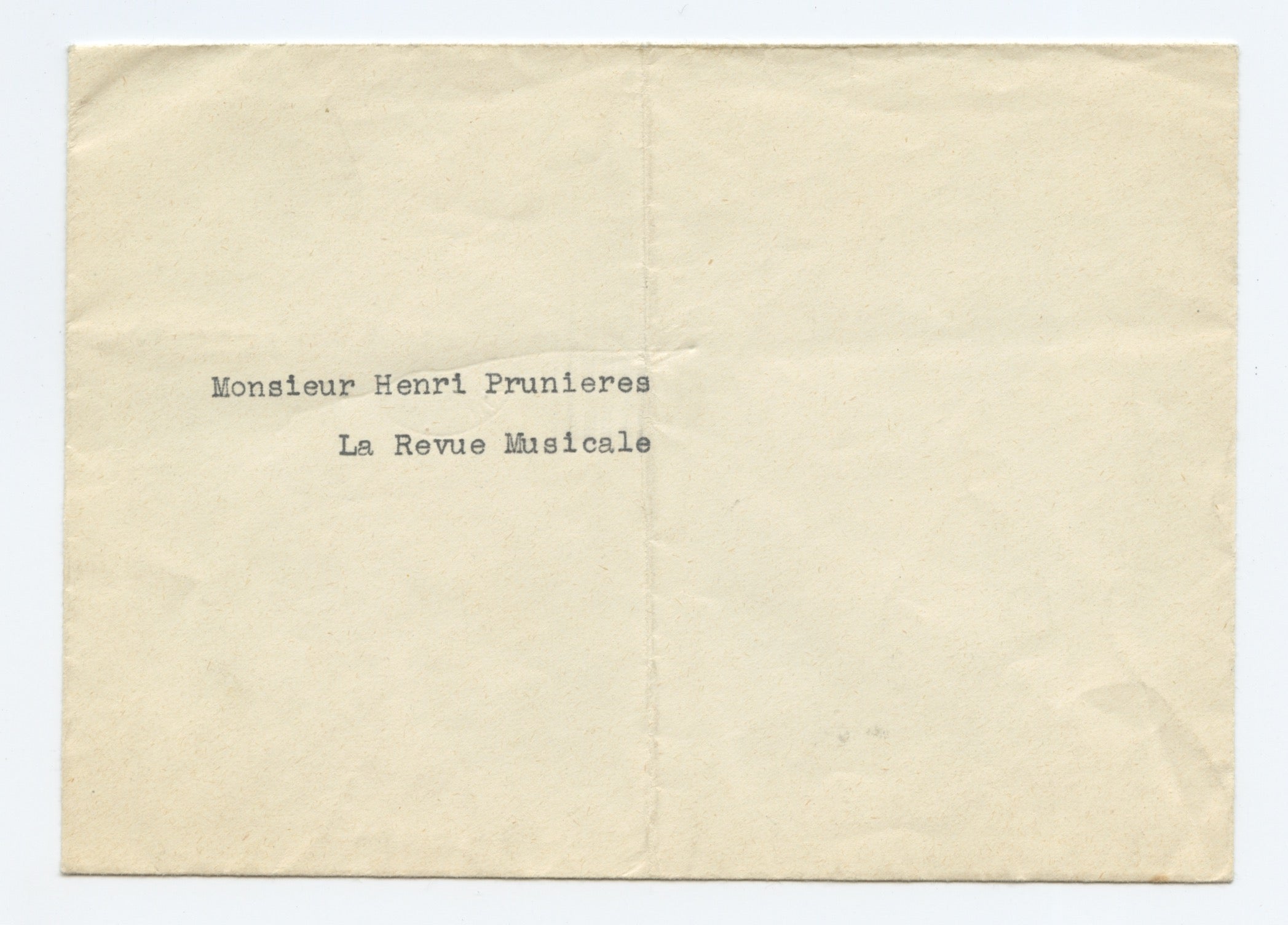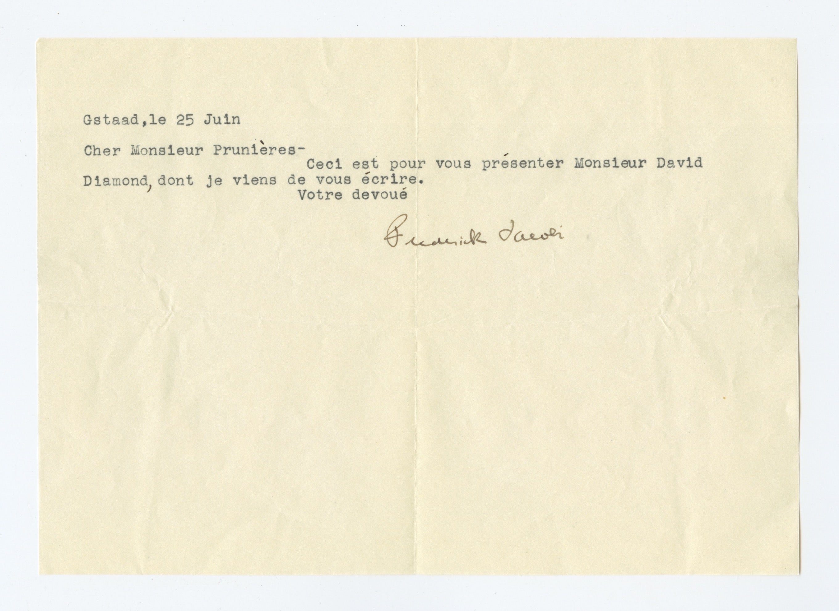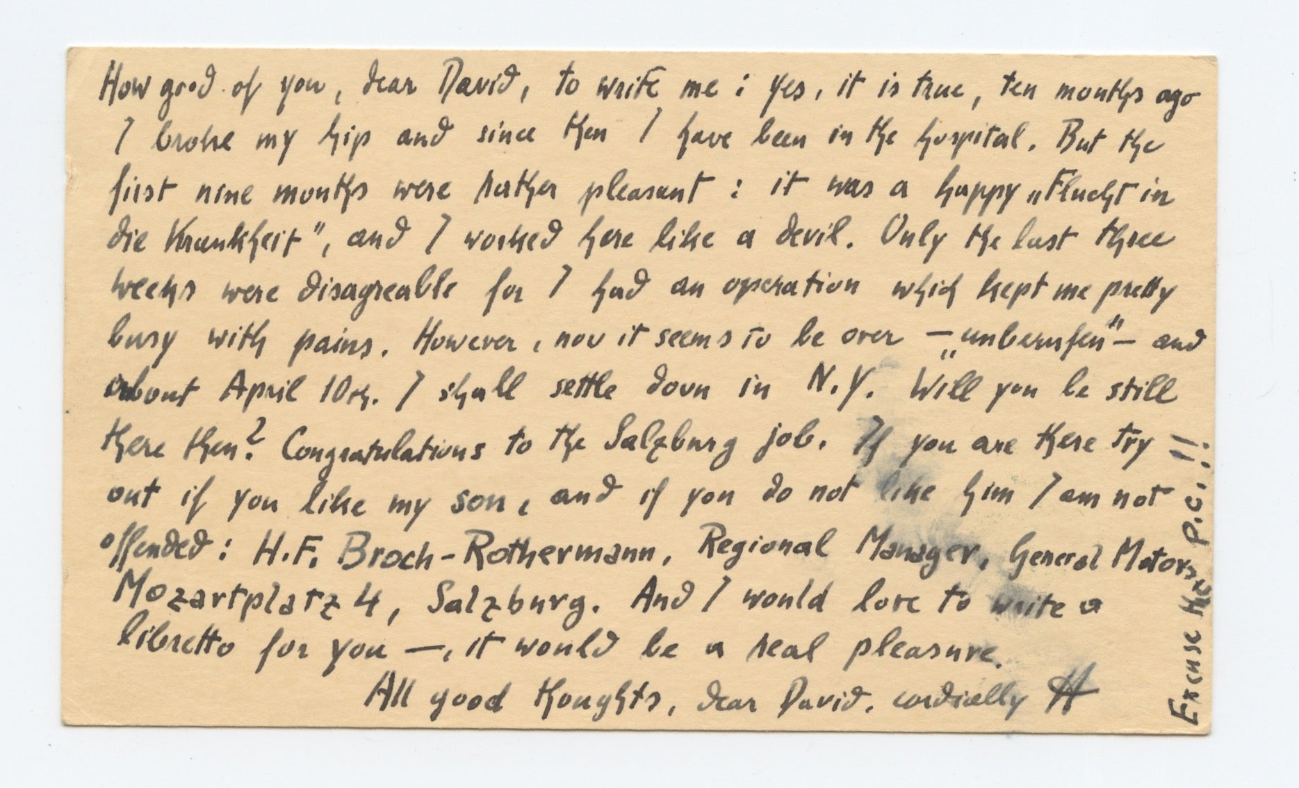 [Diamond, David. (1915–2005)] Despiau, Charles. (1874–1946) & Agee, James. (1909–1955) & Broch, Hermann. (1886–1951) & Green, Julien. (1900–1998) . Collection of Letters to David Diamond. An interesting group of autograph letters signed, addressed to American composer David Diamond. Included are letters from: French sculptor Charles Despiau (Paris, August 1, 1936, 1 p., a short letter in French agreeing to meet Diamond at his atélier in Paris; with a half-tone photograph of the artist); American writer James Agee (New York, April 21, 1950, 1 p., reacting positively to a setting of one of his poems by Diamond: "Wow! That had never occurred to me as settable but [...] seems a damn good idea. I wish I could hear it" and offering several small corrections to the text of a poem; together with a clipped halftone photograph); Austrian writer Hermann Broch (3 autograph postcards, December 19, 1945, October 21, 1946, and March 24, 1949; Broch compliments Diamond on his works "Round" and "The Tempest," and reports on his hip surgery; together with a 5 x 7 photograph of Broch ca. 1945); and American writer Julien Green (Paris, September 5, 1970, 1 p; inviting Diamond to look him up in Paris; together with a half-tone photograph). Also included are a brief typed note signed to Henri Prunières from an unidentified writer, introducing Diamond (Gstaad, June 25, n.y.; with envelope); and an autograph note signed from "Harper" on a postcard photograph showing Diamond posing with a female friend and a large painting (Summer [19]50, 1 p.).
