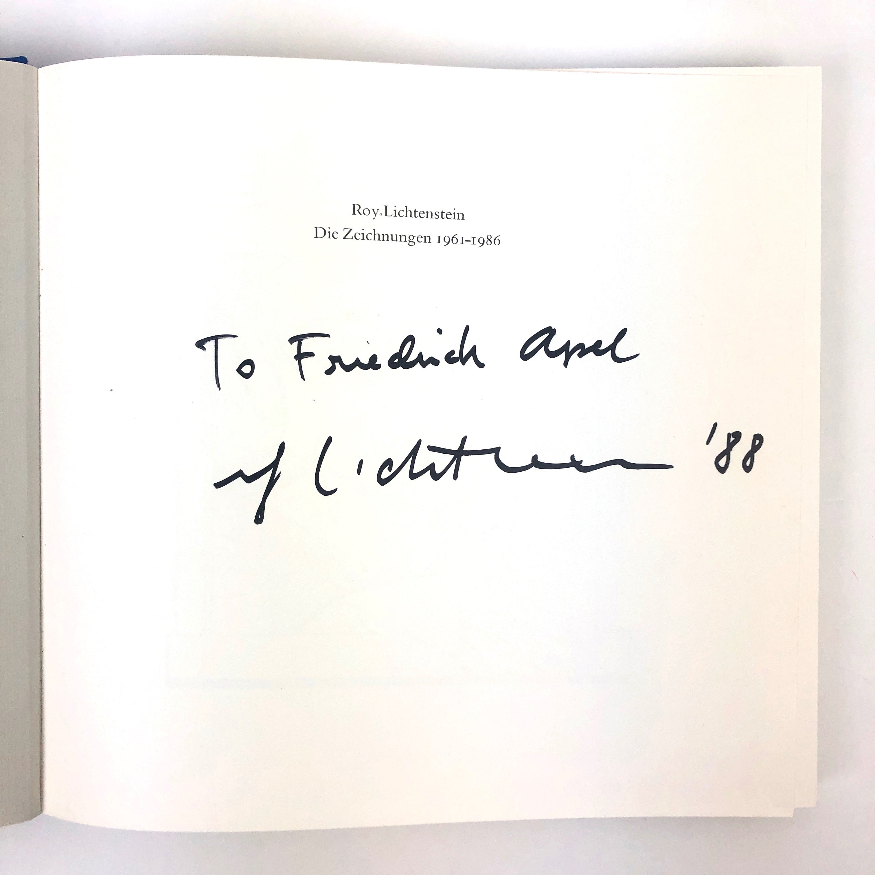 Collection of the American pop artist's drawings from 1961 to 1986, signed and inscribed by the artist on the half-title: "To Friedrich Apel / Roy Lichtenstein '88." 201,(1) pp. Oblong 8vo. Hardcover, blue cloth, dust jacket with detail of one of Lichtenstein's drawings. Some light edge wear to dust jacket, but overall very fine. 10 x 9.5 inches (26 x 24 cm).