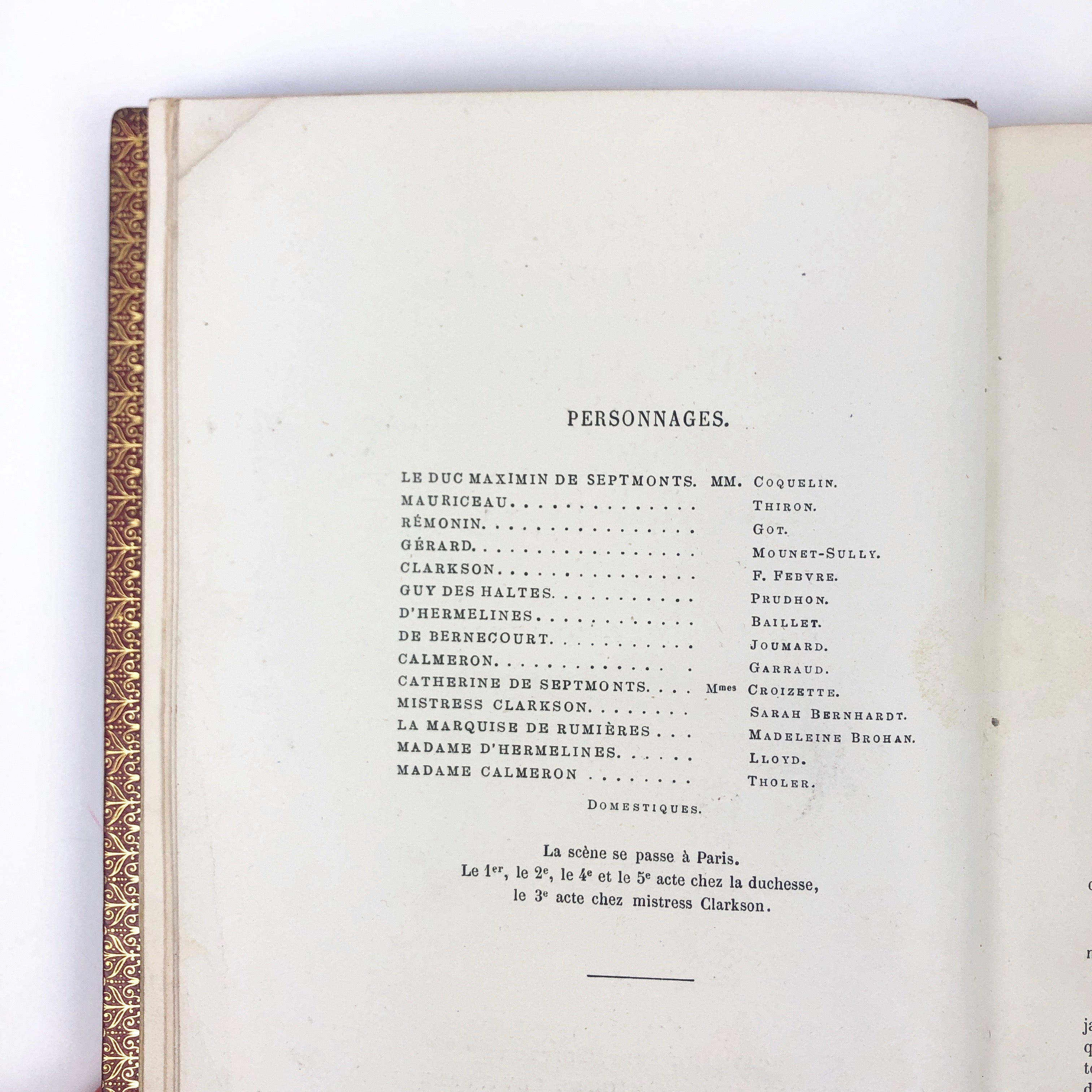 Sarah Bernhardt had a long association with Alexandre Dumas père and fils: it was the elder Dumas who took her to attend her first play at age 15 (where she was overcome by emotion and wept uncontrollably), and then coached her for her audition to the Paris Conservatory. Her breakthrough performance was in a revival of Dumas' Kean in 1868. She then went on famously to star in Dumas fils' play La Dame aux Camélias, a role which would become her signature. Among her other Dumas roles was that of Mistress Clarkson in the present play, L'Étrangère, premiered at the Théâtre-Français on February 14, 1876. Although this work, a comedy on modern Parisian life, is not generally considered one of Dumas' finest, Bernhardt won accolades for her performance.