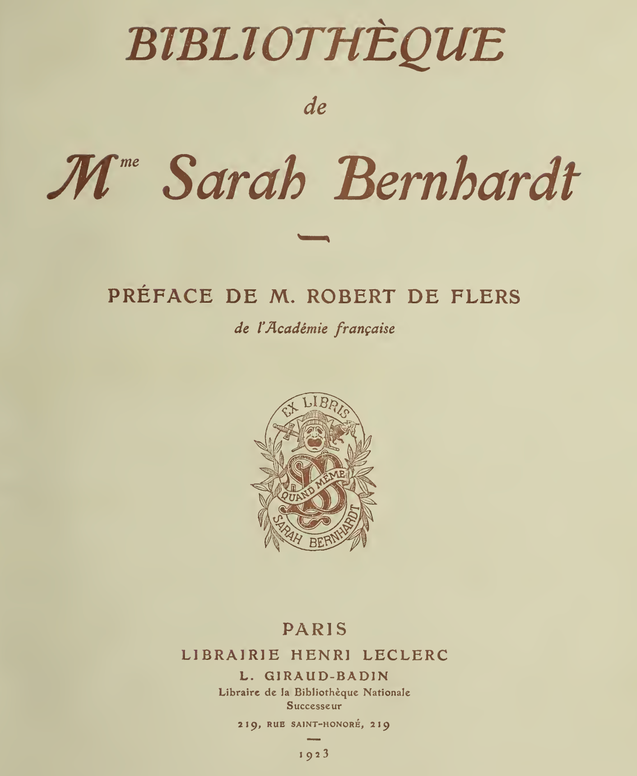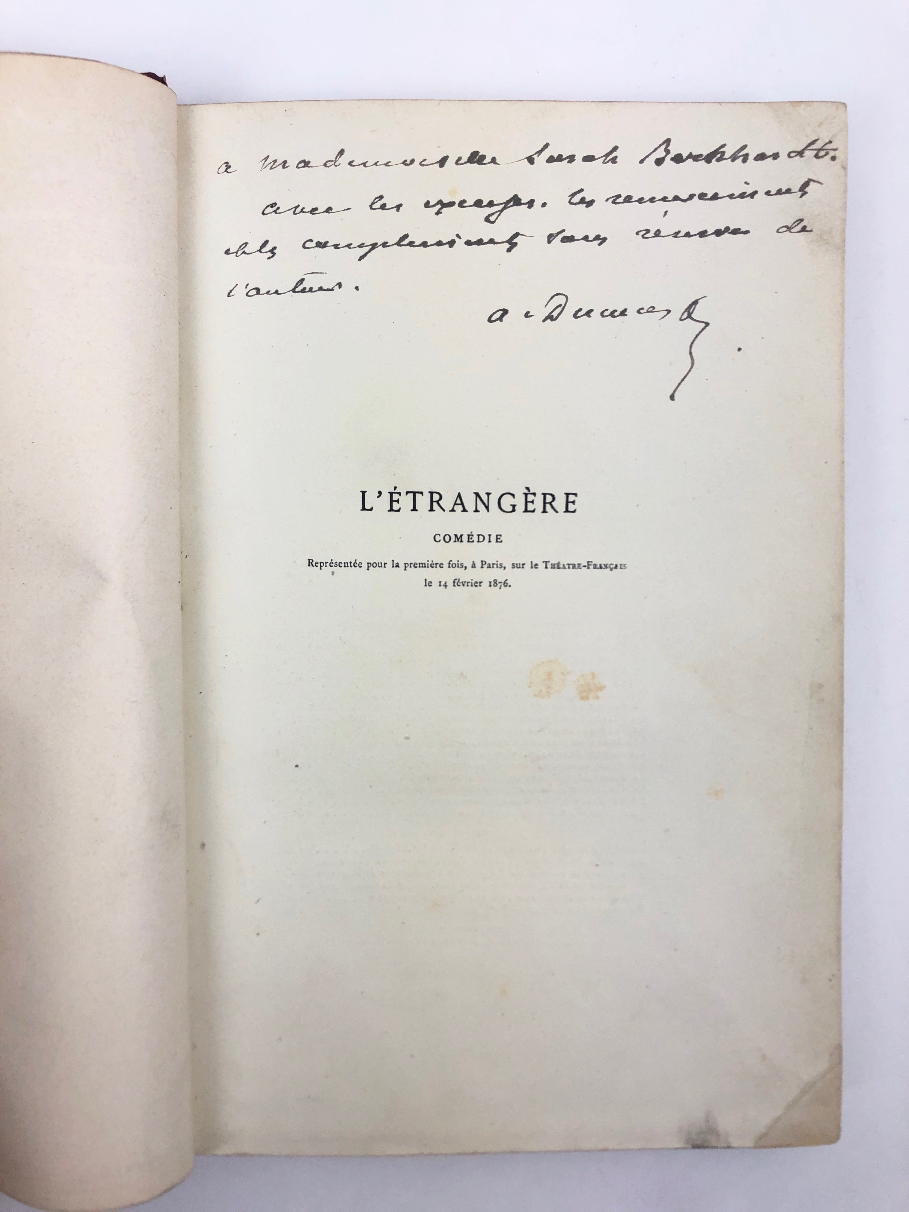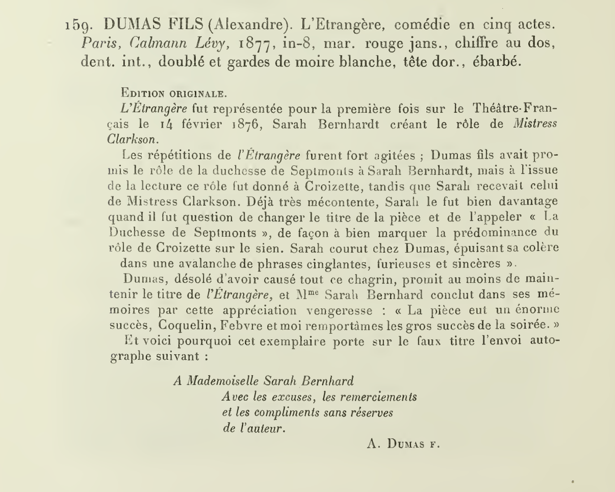 Presentation copy of the French author's play L'Étrangère, signed and inscribed by Dumas on the half-title to the important French actress Sarah Bernhardt, who starred in the original production. He pens (translated from the French): "To Mademoiselle Sarah Bernhardt, with the apologies, thanks, and unreserved compliments of the author, A. Dumas." 148 pp. Hardcover, 8vo, handsome contemporary red morocco with gilt; raised bands, title and Bernhardt's initials in gilt at the foot of the spine; silk endpapers. Neatly restored, faint water stain to endpapers; some light internal foxing; overall fine. The present volume appears in the catalogue of the Library of Sarah Bernhardt (https://ia800900.us.archive.org/22/items/bibliothquedemme00bern/bibliothquedemme00bern.pdf ) as lot 159, images included here for reference.