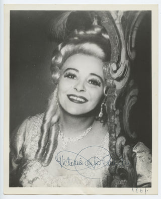 De Los Angeles, Victoria. (1923–2005). Signed Photograph as Manon. Signed portrait photograph of the Spanish soprano, incomparable in La Boheme, Manon and Madama Butterfly and a specialist in French and Spanish art song. She is shown in her role as Manon and has signed at the foot, dating 1961. Stamped on the verso by presenter Sol Hurok and with the role identified in pen on the verso. Very fine. 8 x 10 inches (20.6 x 25.4 cm).