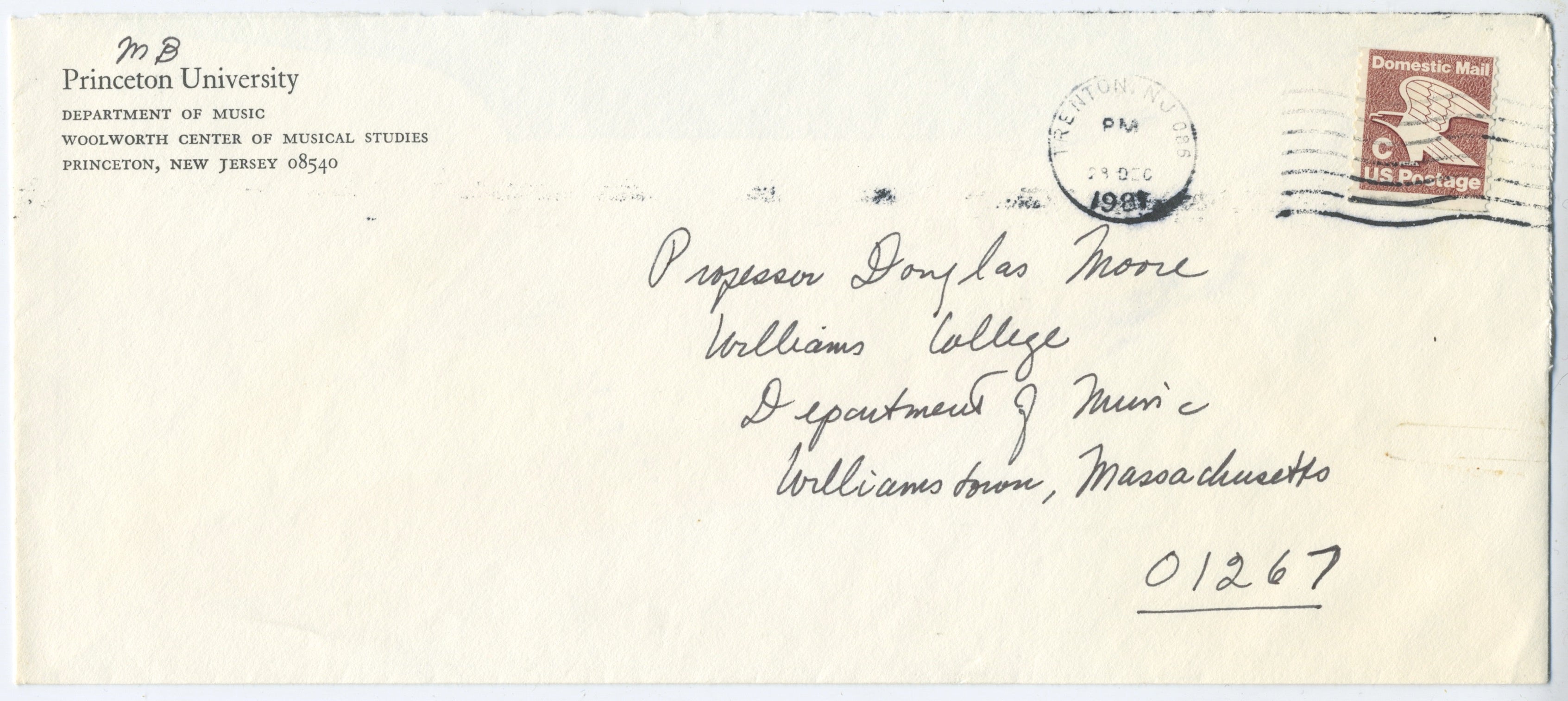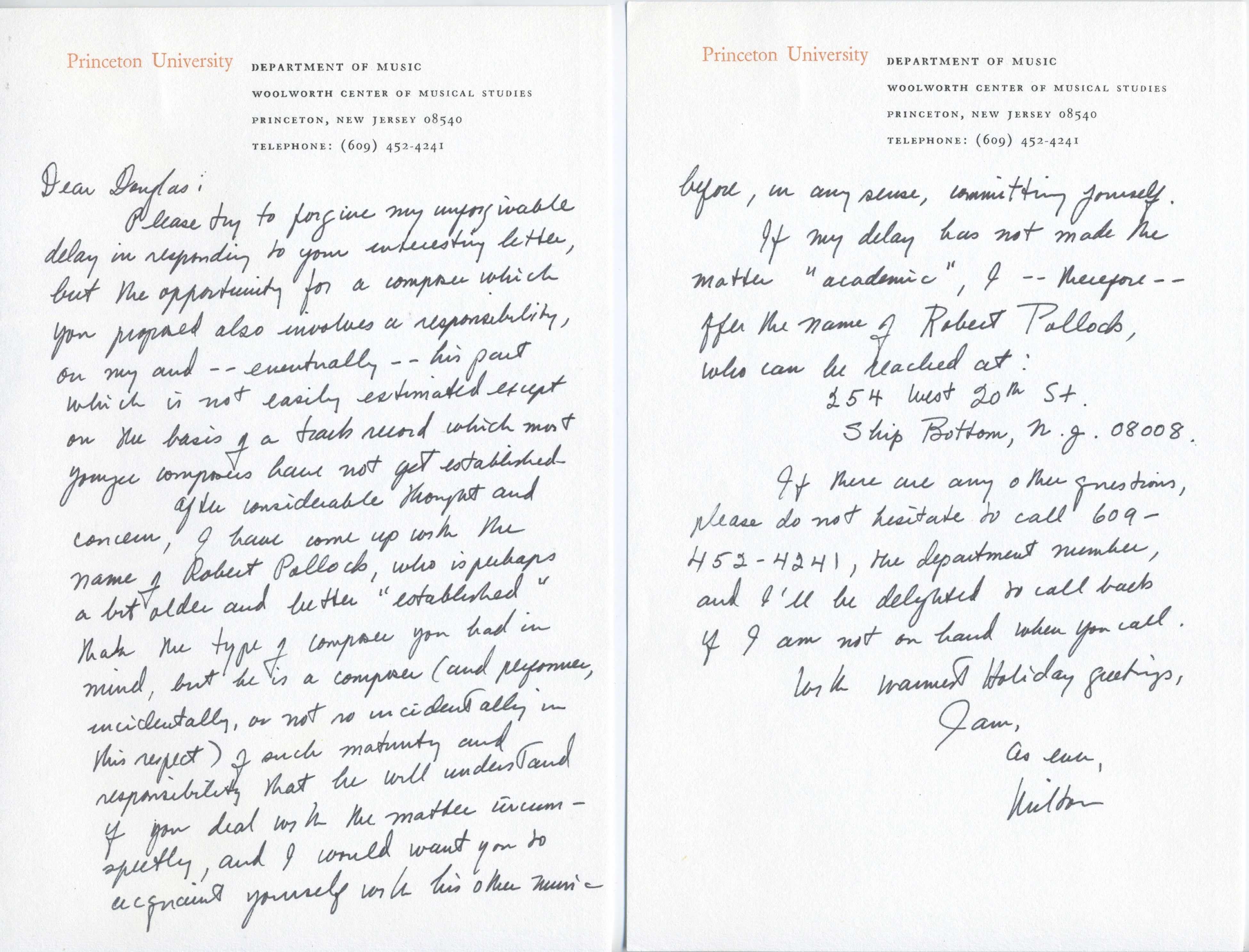 Autograph letter signed from the important American composer to cellist Douglas Moore, suggesting that he collaborate with the composer Robert Pollock. 2 pp., n.d., on Princeton University Music Department letterhead, with envelope postmarked December 28, 1981. Babbitt writes: "Dear Douglas: Please try to forgive my unforgivable delay in responding to your interesting letter, but the opportunity for a composer which you proposed also involves a responsibility, on my and—eventually—his part which is not easily estimated except on the basis of a track record which most younger composers have not yet established. After considerable thought and concern, I have come up with the name of Robert Pollock, who is perhaps a bit older and better 'established' than the type of composer you had in mind, but he is a composer (and performer, incidentally, or not so incidentally in this respect) of such maturity and responsibility that he will understand if you deal with the matter circumspectly, and I would want you to acquaint yourself with his other music before, in any sense, committing yourself. [...] I am, as ever, Milton." Very fine. 5.5 x 8.5 inches (14 x 21.7 cm).