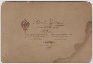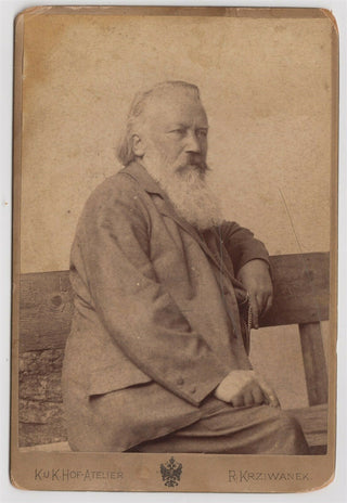 Original period cabinet photograph by R. Krzinanek of Vienna. The important composer is shown seated on a bench, in half profile to the right. Rather heavily toned with some water damage to the verso and some edge wear. Overall very good. 4.25 x 6.5 inches (10.8 x 16.3 cm).