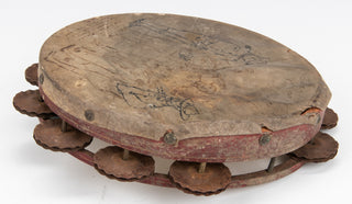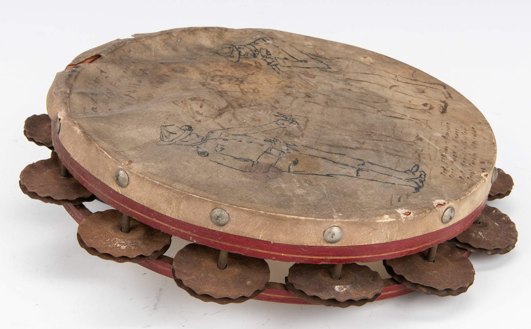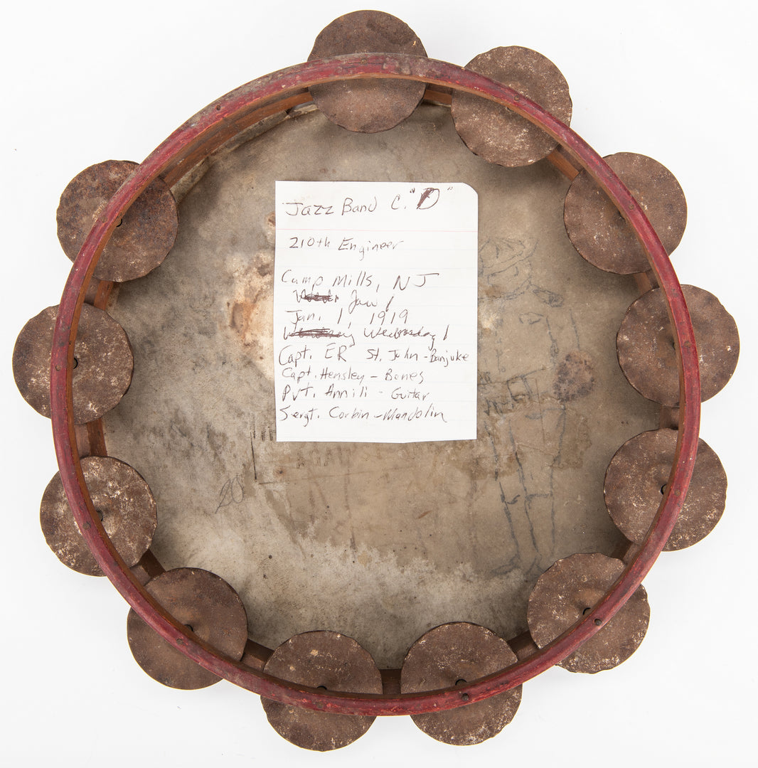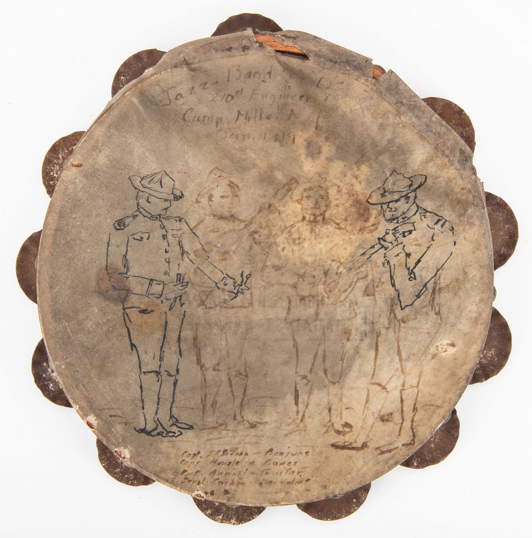 An original tambourine from the World War I era, with a hand-drawn sketch of four musicians in Army uniforms on the drumhead. Penned at the head: "Jazz-Band [...] / 210th Engineers / Camp Miller, N. Y. / Jan. 1, 1919." The names of four soldiers are penned at the foot: "Capt. ER St. John - Banjuke / Capt. Hensley - Bones / Pvt. Annili - Guitar / Sergt. Corbin - Mandolin." A slip of paper with later writing transcribing this information is affixed to the underside of the drumhead. Drumhead partially detached from the frame, heavily toned with the ink quite faded; jingles heavily rusted. Overall good. 8 inches in diameter x 1.24 inches high.