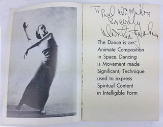Republication of editor and designer Merle Armitage's 1937 volume on the important dancer and choreographer, signed and inscribed by Graham on the first page: "To Paul McMahon / Sincerely, Martha Graham." 132 pp. Softcover. Spine faded, small split to front gutter; overall fine. 5.25 x 8 inches (13.5 x 20.3 cm).
