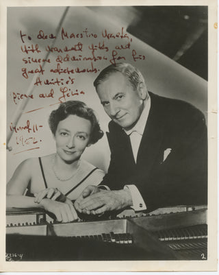 Signed photograph of the celebrated husband-and-wife piano duo, inscribed to Walter Mantani, conductor of the Midland Odessa Symphony (Texas): "To dear Maestro Walter, with warmest warmest wishes and sincere admiration fo his great achievements. Amitiés, Pierre and Genia. March 11, 1962." The duo performed in Midland on March 10, 1962. Mounting remnants to verso; some light wrinkling; overall fine. 8 x 10 inches (20.5 x 25.5 cm).
