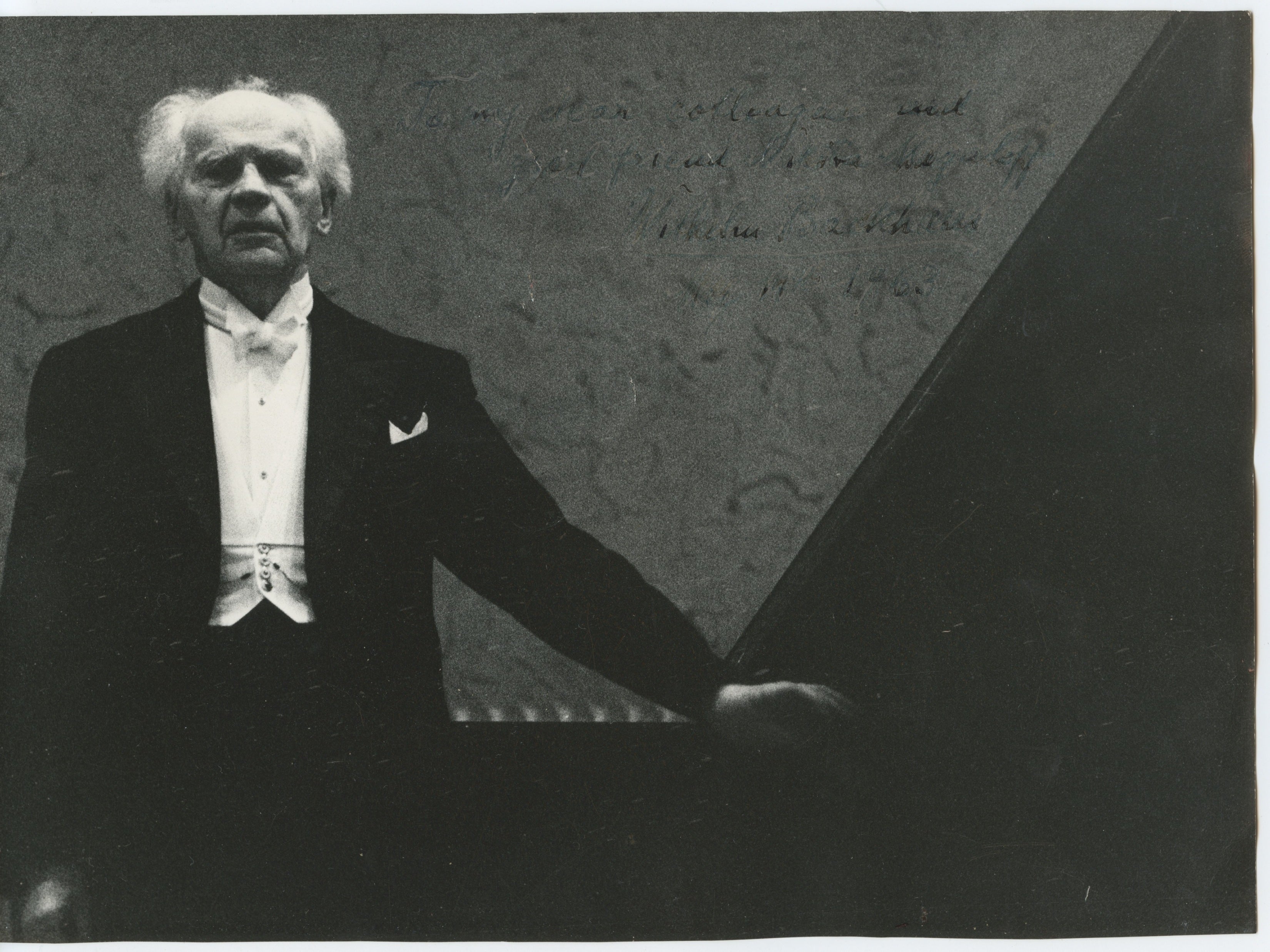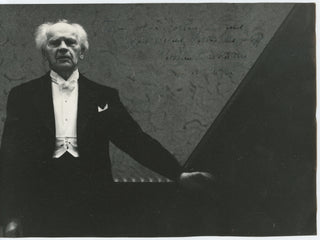 Signed photograph from the important German pianist, inscribed to pianist Nikita Magaloff. Backhaus is shown standing with his arm on the piano and has penned at the head of the photograph: "To my dear colleague and good friend Nikita Magaloff / Wilhelm Backhaus / May 14th, 1963." A note on the verso in another hand indicates the photo was taken at Backhaus' concert in Bad Godesberg on May 6, 1962. Stamped on the verso by Camillo Fischer of Bonn. Rather wrinkled with one strong diagonal crease; inscription with poor contrast, best visible at an angle; overall very good. 9.5 x 7 inches (23.8 x 17.5 cm).