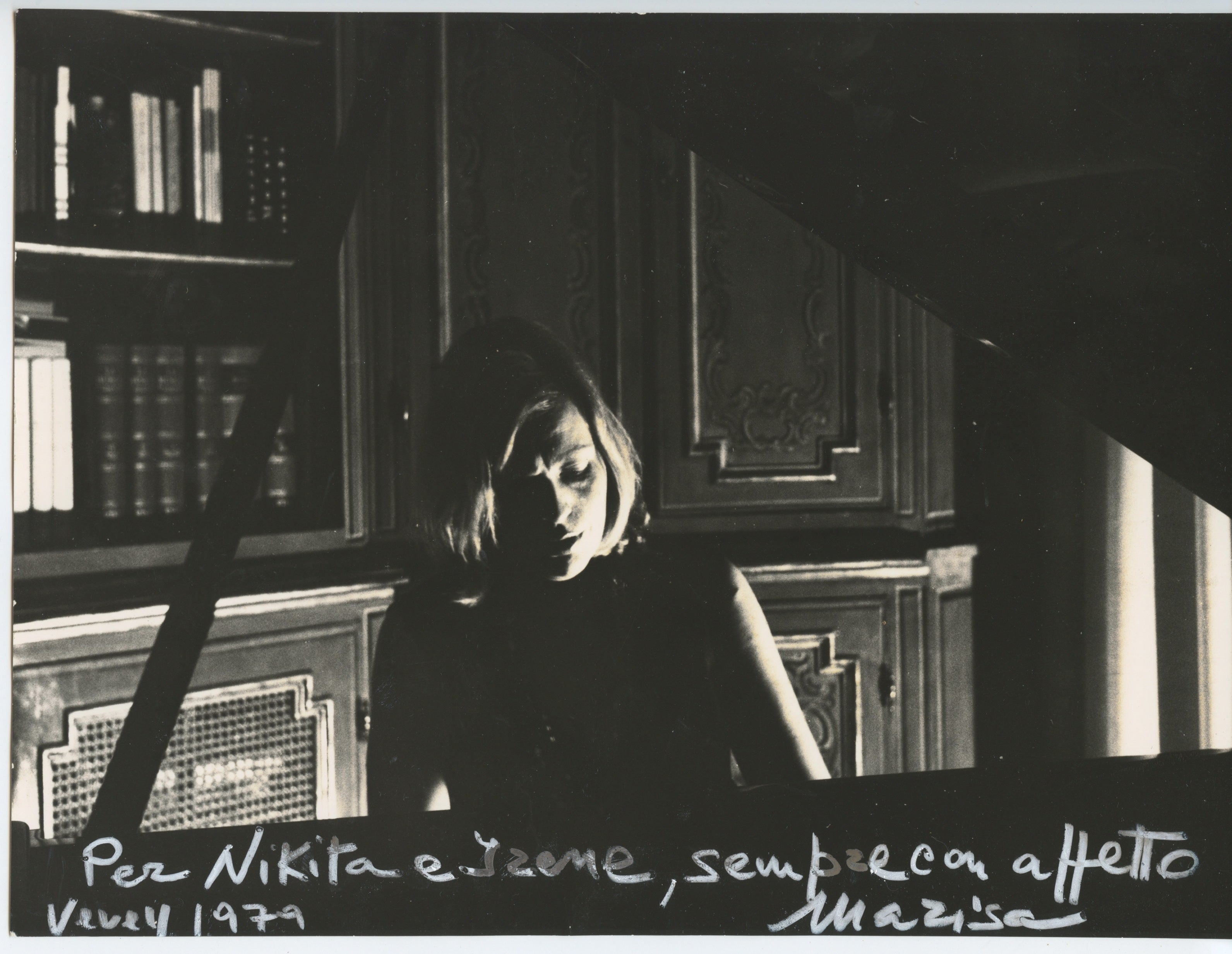 Signed postcard photograph of the Italian pianist and actress, mother of former French First Lady Carla Bruni. She is shown in a dramatically-lit portrait at the piano and has inscribed at the foot to pianist Nikita Magaloff and his wife Irene: "Per Nikita e Irene, sempre con affetto, Marisa / Vevey 1979." Some light edge wear; overall fine. 9 x 6.75 inches (23 x 17.3 cm).