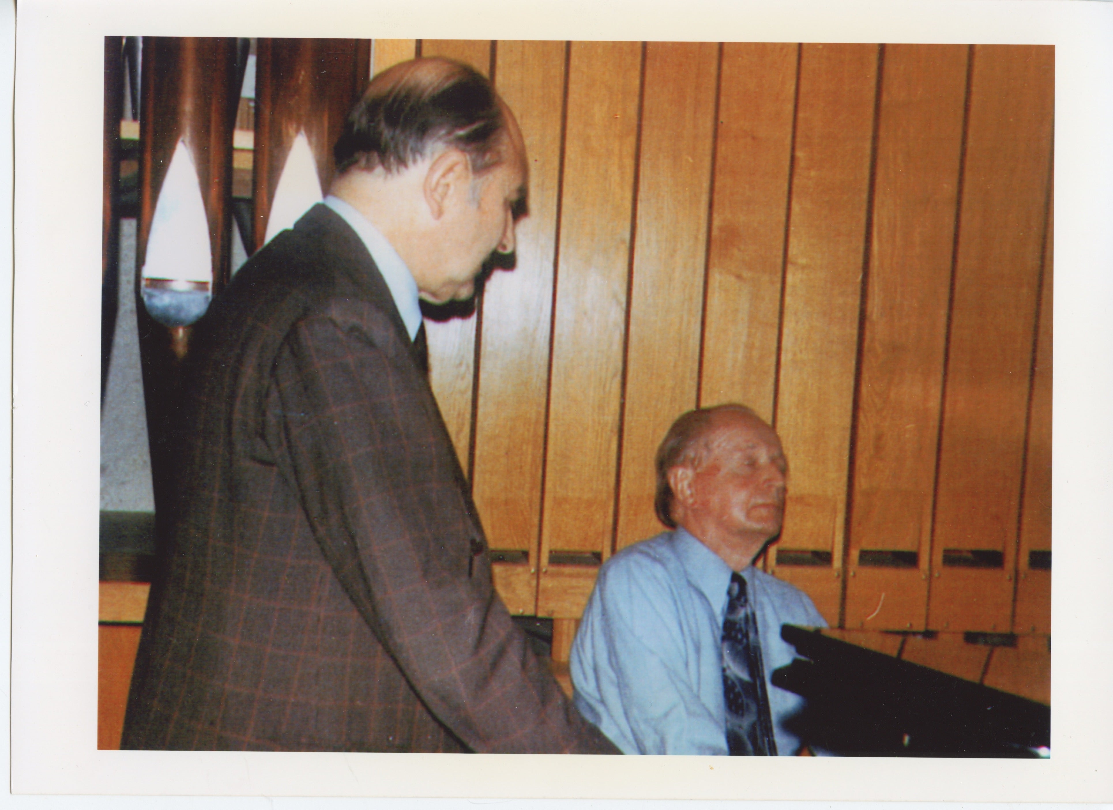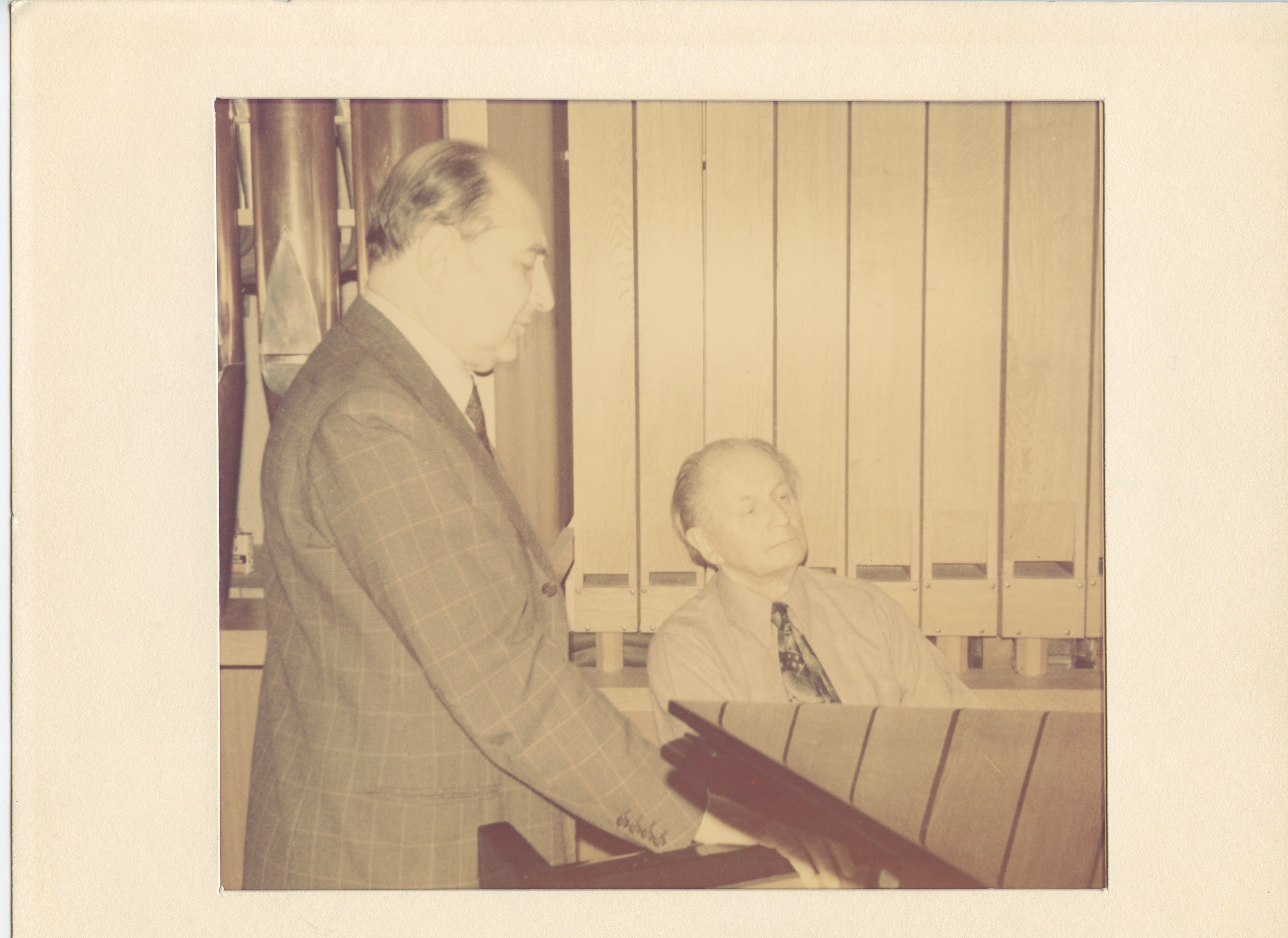 Two color photographs of the great German pianist, together with his friend and fellow pianist Nikita Magaloff. Kempff is seated at the piano at the right while Magaloff stands at the left; in the background, organ pipes are visible. One photograph (8 x 8 inches) rather faded and taped to a window mount to an overall size of 11 x 8.5 inches; the other photograph a later digital print, 8 x 11 inches. Overall fine.