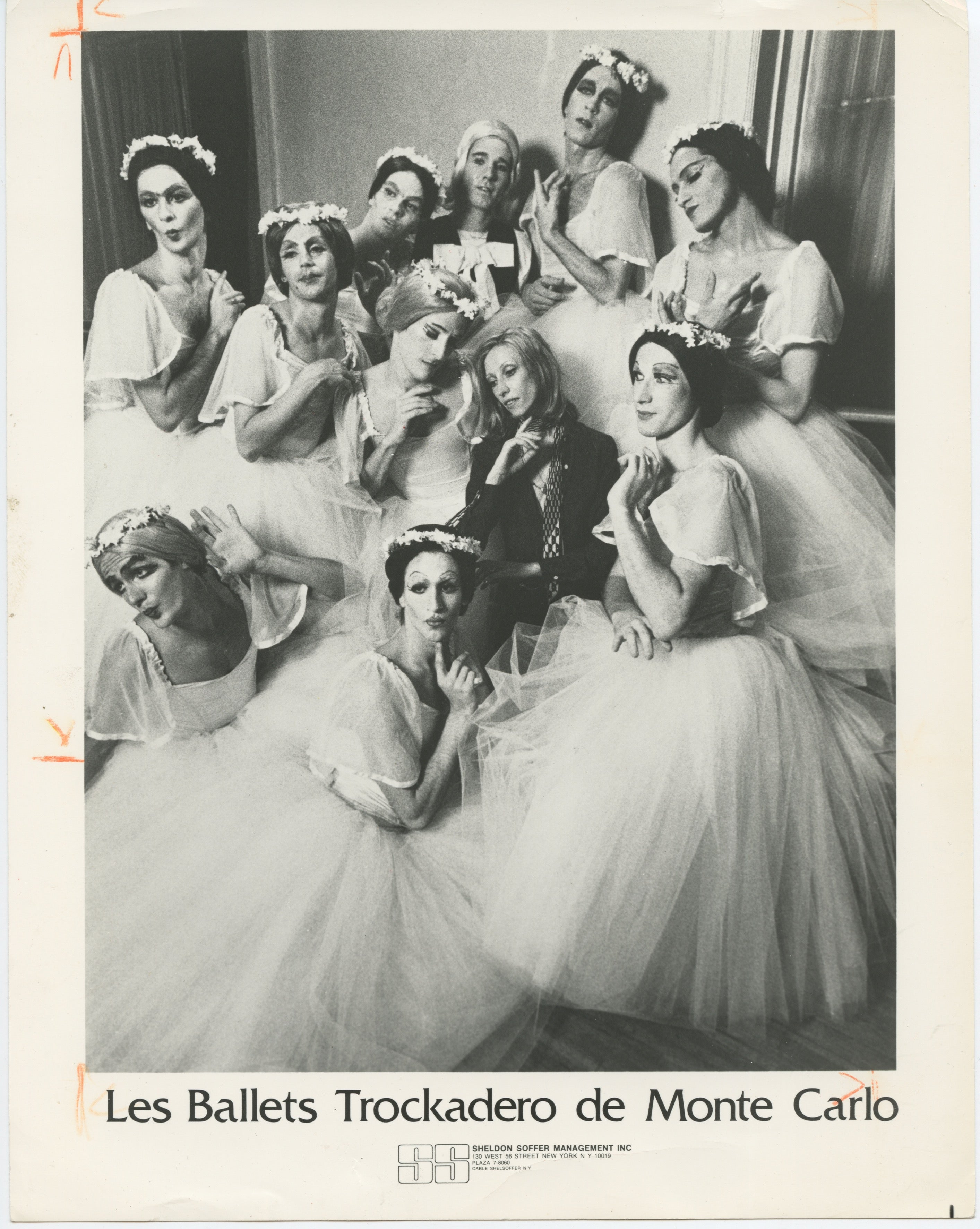 Early promotional photograph, ca. 1975, of the all-male drag ballet troupe, who are shown posing around Russian ballerina Natalia Makarova. Crop marks to the margins; overall very good. 8 x 10 inches (20.3 x 25.8 cm).