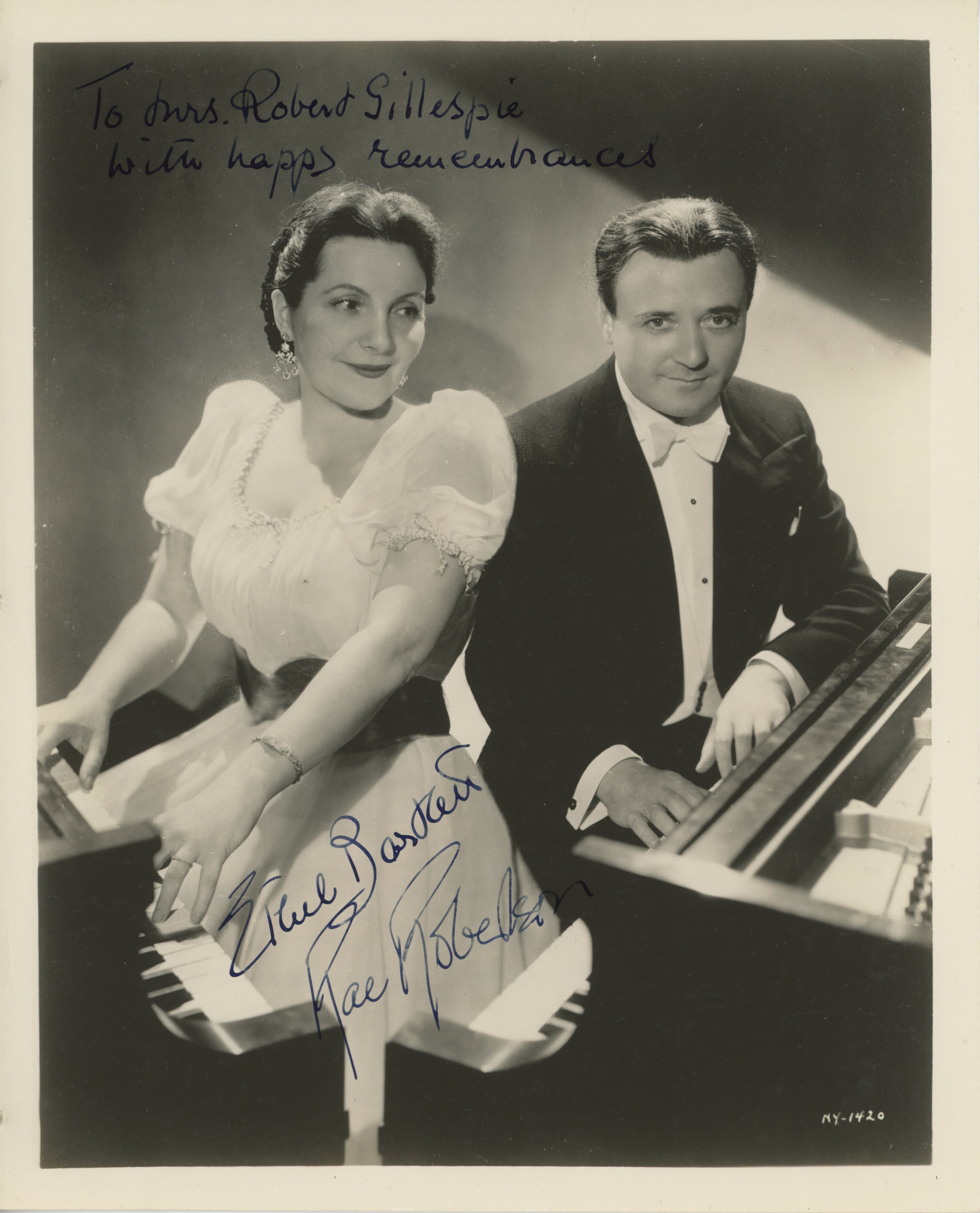 Bartlett, Ethel. (1896 - 1978) & Robertson, Rae. (1893 - 1956). Signed Photograph. Charming photograph of the piano-duo, shoulder-to-shoulder, each sitting at their own instrument, signed and inscribed "To Mrs. Robert Gillespie/ with happy remembrances/ Ethel Bartlett/ Rae Robertson." 8 x 10 inches (21.5 x 25.8 cm). Small crease at the top, three small notches on the left side, otherwise fine.