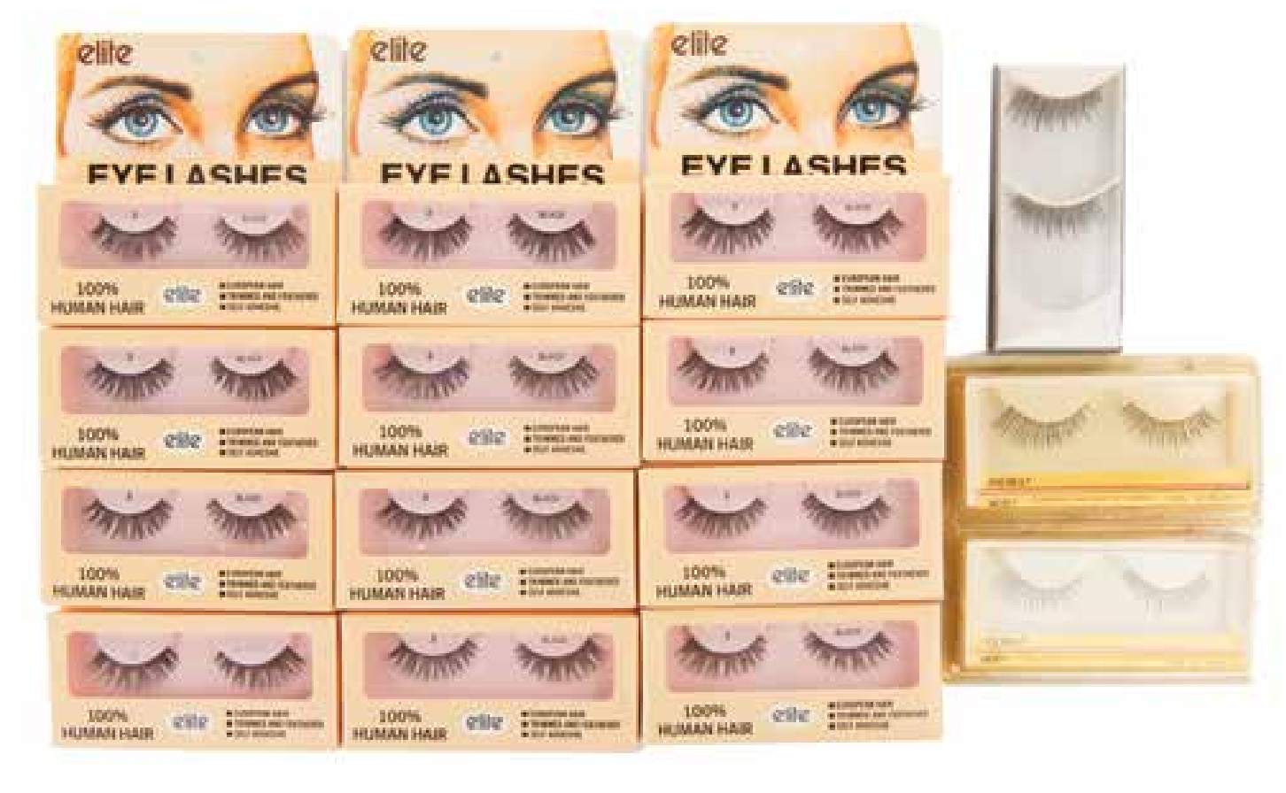 Original collection of Liza's unworn black false eyelash sets. Includes 12 pairs of Elite brand eyelashes (100% human hair, trimmed, feathered, self-adhesive), 2 pairs of Andrea brand eyelashes (style 45 black), and 1 pair of Mac brand eyelashes. The iconic pixie cut and exuberant eyelashes of the singer and actress have remained constant throughout evolutions of her style. All in unused fine condition. Provenance: Liza Minnelli Collection.