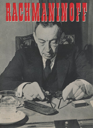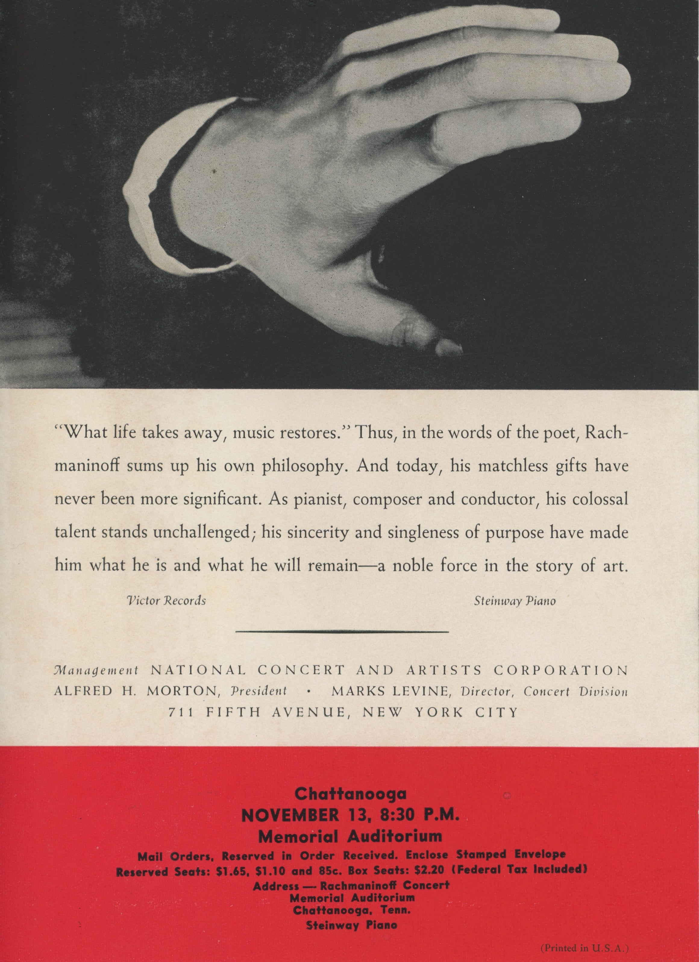 Printed broadside advertising a performance at Memorial Auditorium in Chattanooga, TN on November 13 at 8:30 P.M, year unknown. Recto featuring a photograph of the composer and pianist at his desk, setting down his glasses; verso with a close-up of his left hand, and text. Box seats for the concert, the flyer notes, would have cost you $2.20. 6.5 x 9 inches (16.5 x 22.7 cm). Some very light wear and marking on the back, otherwise in fine condition.