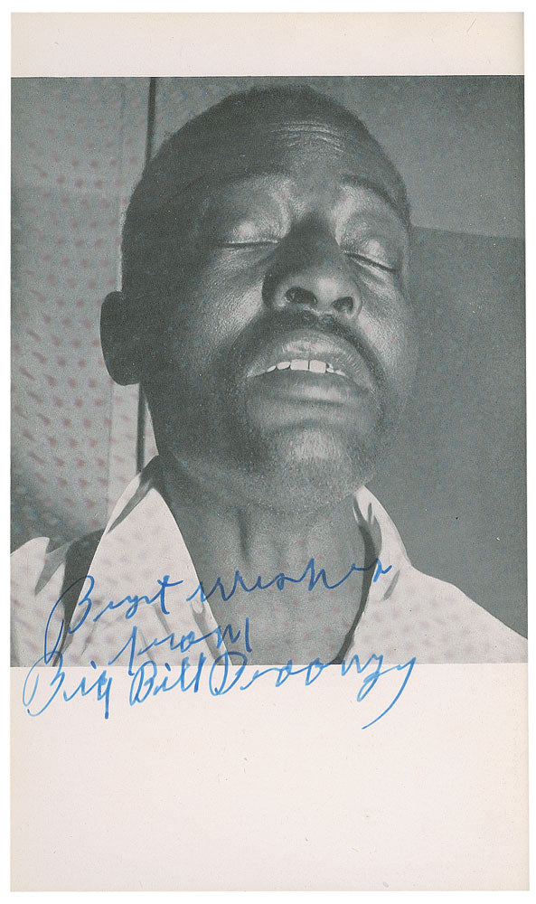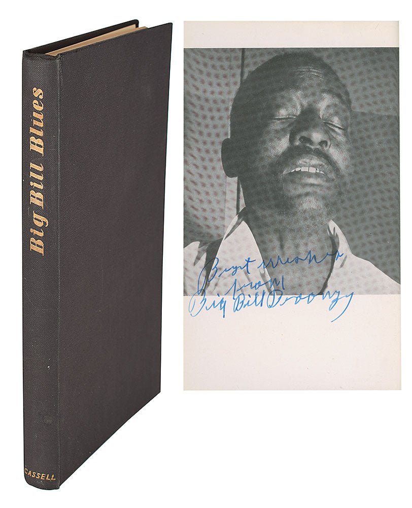 Broonzy, Big Bill. (1893–1958). Big Bill Blues: William Broonzy's Story - SIGNED ON HIS PORTRAIT PHOTOGRAPH. London: Cassell & Company. 1955. First Edition. Rare signed volume from the American blues singer, songwriter and guitarist who was one of the key figures in the development of blues music in the 20th century; he became an international star in the 1950s when he returned to his traditional folk-blues roots and became one of the leading figures of the emerging American folk music revival. Hardcover, 5.25 x 8.75, 139 pages. Signed on the frontispiece in blue felt tip, "Best wishes, from, Big Bill Broonzy." In fine condition.