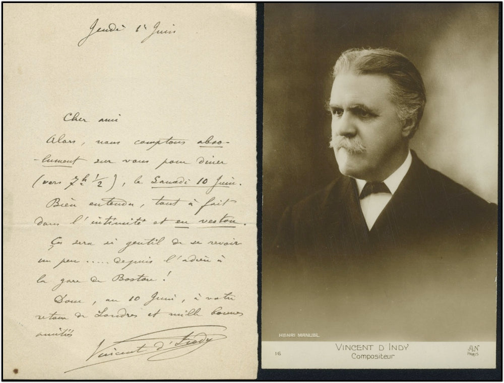 It is possible that the letter is addressed to conductor Pierre Monteux, who led the Boston Symphony from 1919-24 and who introduced a number of works by D'Indy to Boston during his tenure there. Sold together with a nice period postcard portrait photograph of the composer.