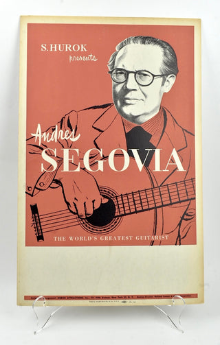 Segovia, Andrés. (1893–1987). The World's Greatest Guitarist Poster. Poster advertising a concert by the great Spanish guitarist, presented by impresario Sol Hurok, though the concert specifics were left unapplied to the blank lower section. Uneven toning throughout with minor wear to edges, else fine. 14 x 22 inches (35.5 x 56 cm.)