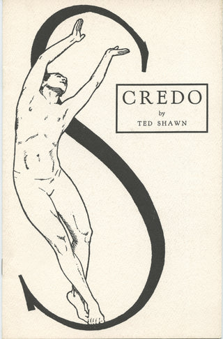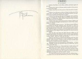 Fine privately printed 8vo booklet with cover illustration, including 4 pages of text, the "Credo" of the great dancer/choreographer. Boldly signed by Shawn opposite first page of text in black ink at time of issue. In very fine condition.