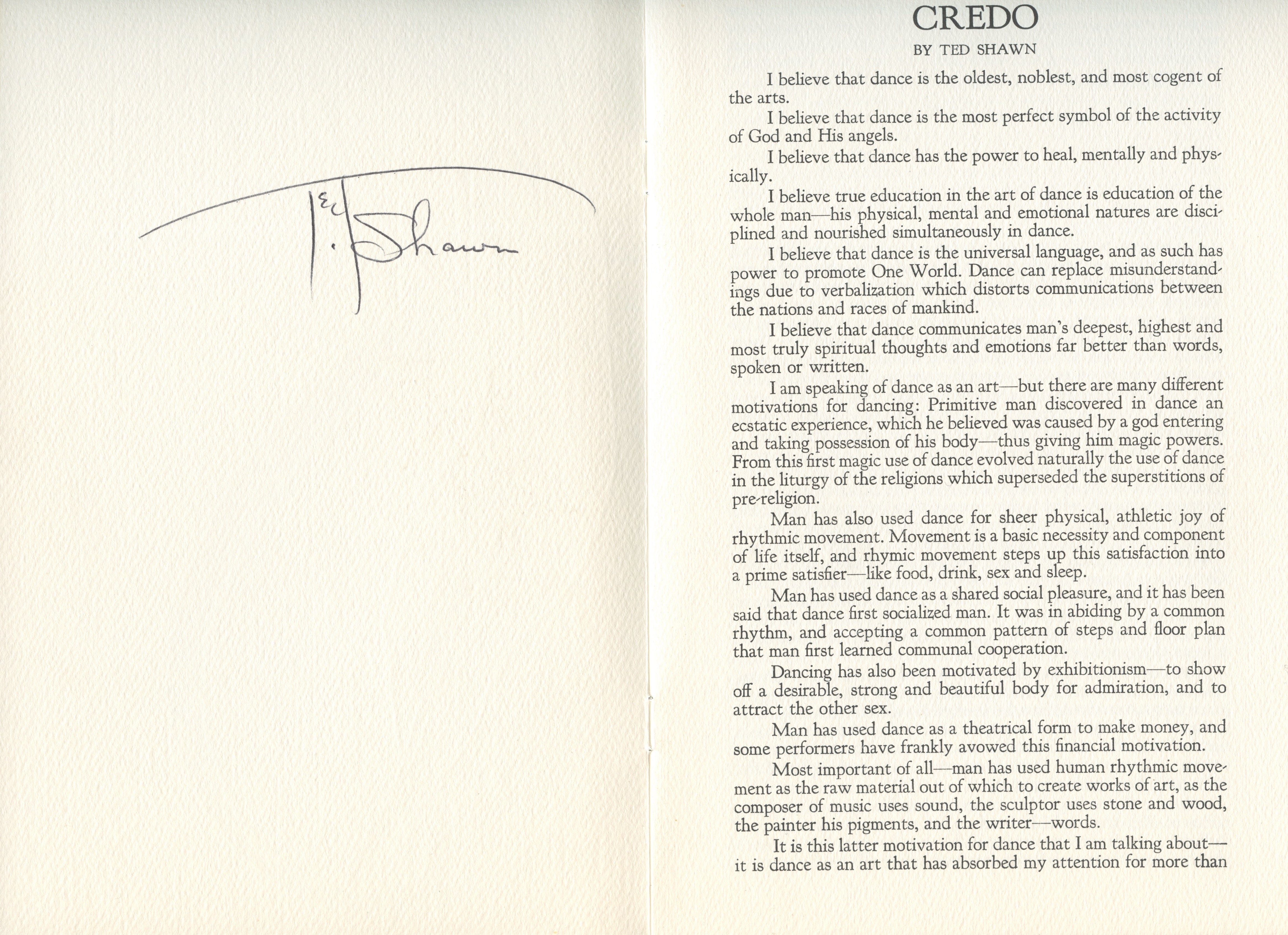 Shawn, Ted. (1891–1972). Signed "Credo.". [1960]. "I believe that DANCE is a way of life, which will lead humanity into continually higher and greater dimensions of existence."