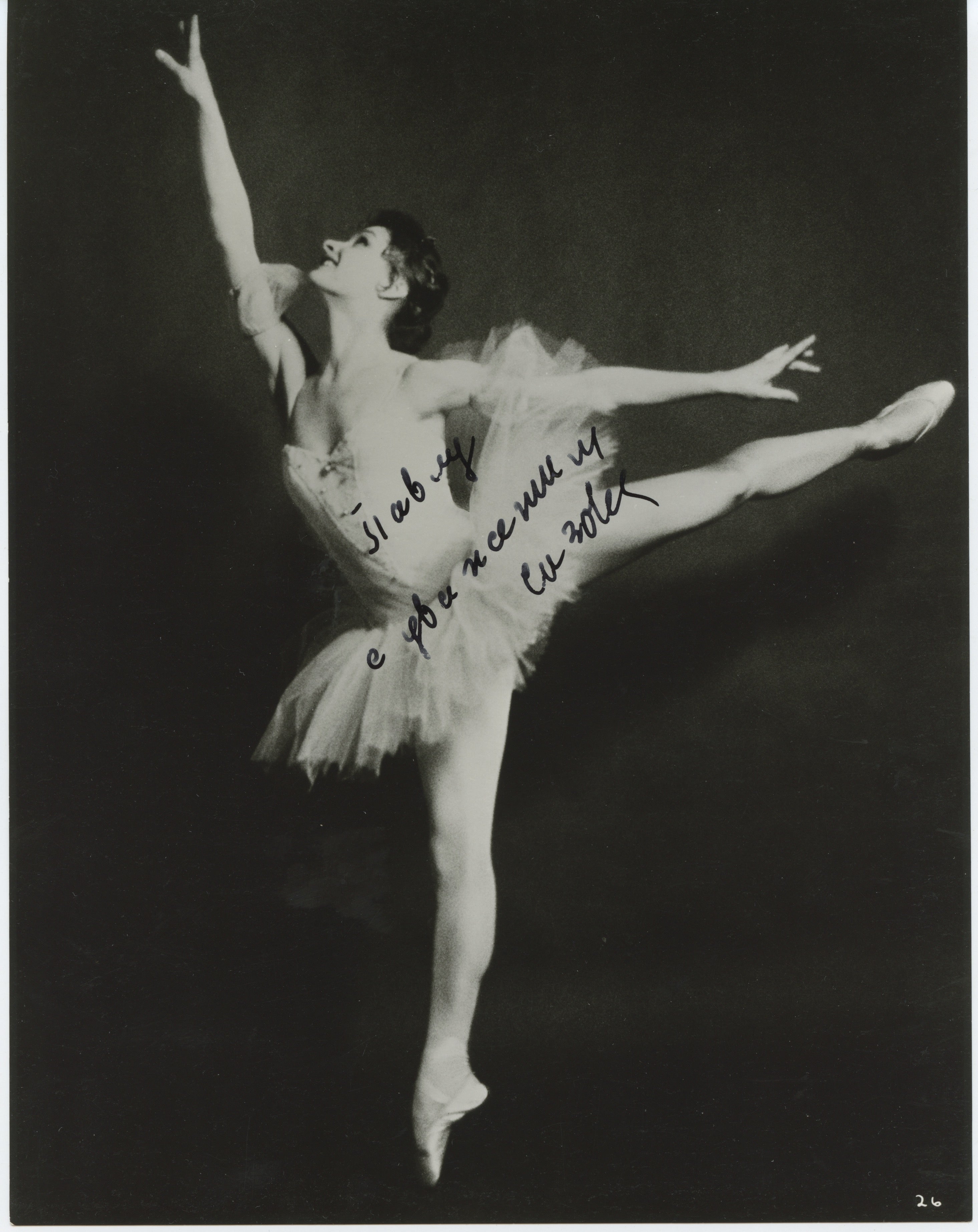Sizova, Alla. (1939–2014). Signed Photograph. Signed and inscribed photograph of the great Russian ballerina in costume for a production of The Sleeping Beauty. Stamp on the verso identifying Sizova as a member of the Leningrad Kirov Ballet (Formerly the Maryinsky Ballet). 7.25 x 9.25 inches (18.5 x 23.5 cm.), light surface marks, else fine.