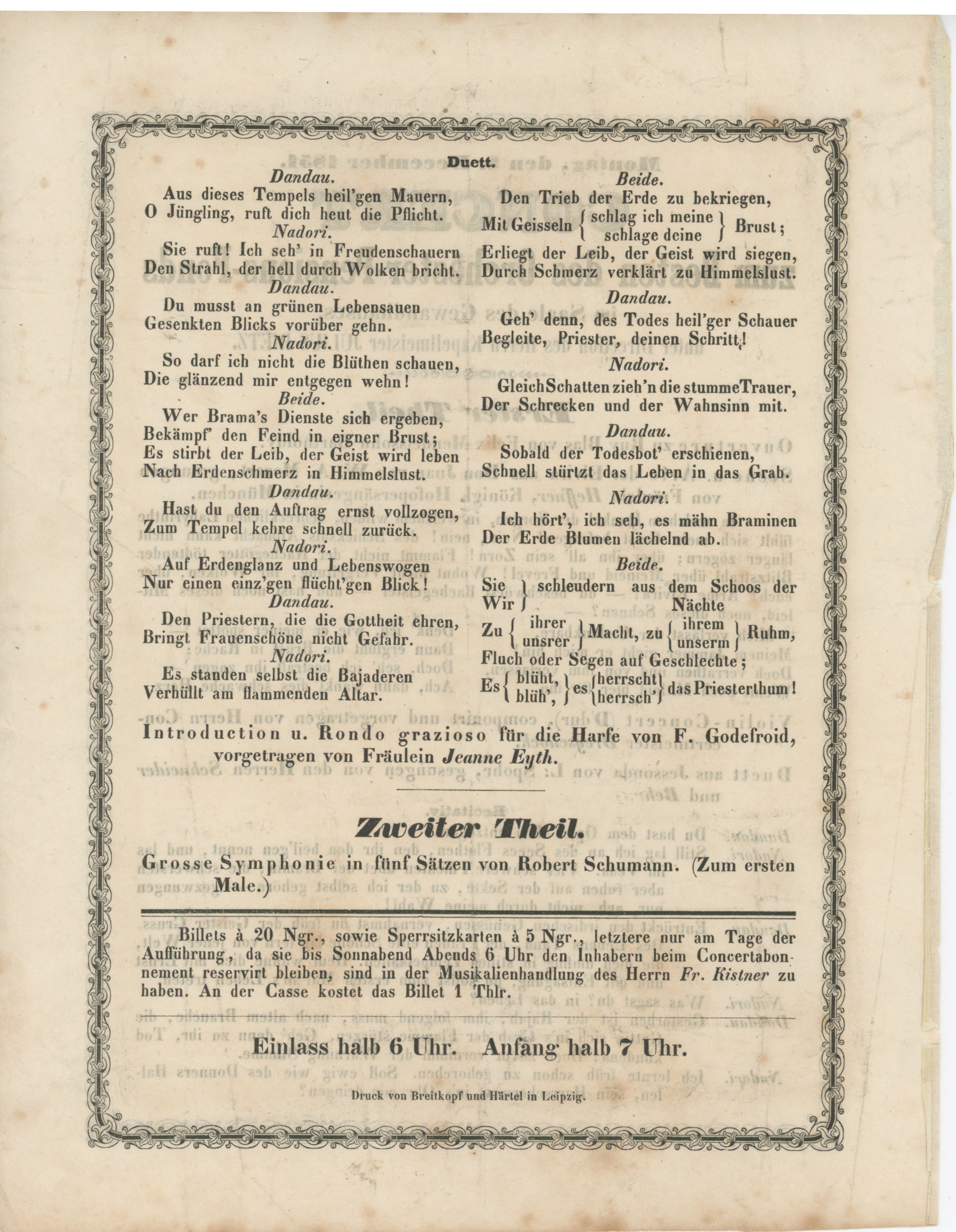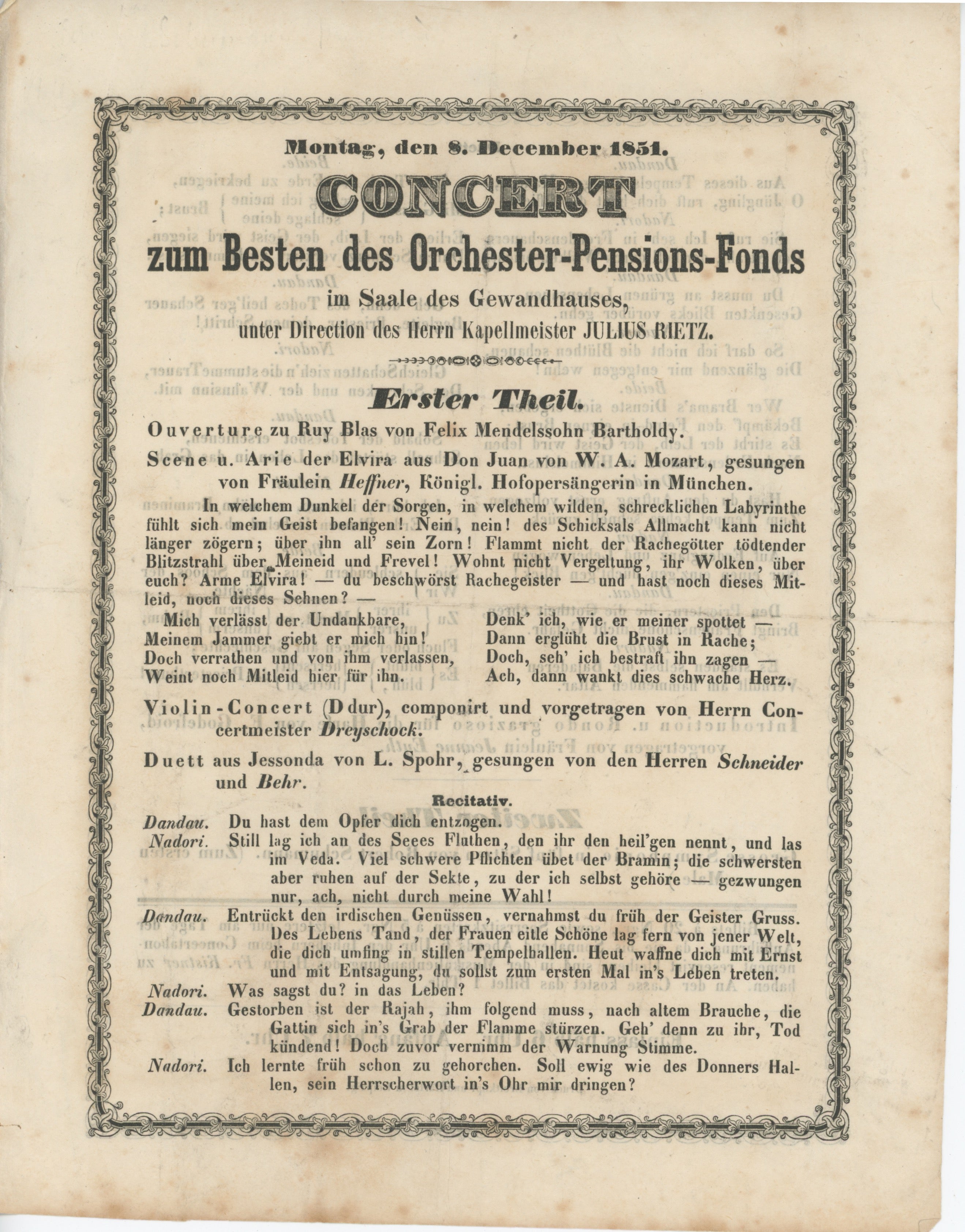 [Schumann, Robert. (1810–1856)] [Mendelssohn-Bartholdy, Felix. (1809–1847)] [Leipzig Gewandhaus Orchestra]. Original 1851 Program including the Leipzig premiere of Schumann Symphony No. 3. "Montag, den 8. December 1851. Concert zum Besten des Orchester-Pensions-Fonds im Saale des Gewandhauses, unter Direction des Herrn Kapellmeister Julius Rietz." [Concert for the benefit of the pension fund for the Gewandhaus Orchestra under the direction of Julius Rietz.].