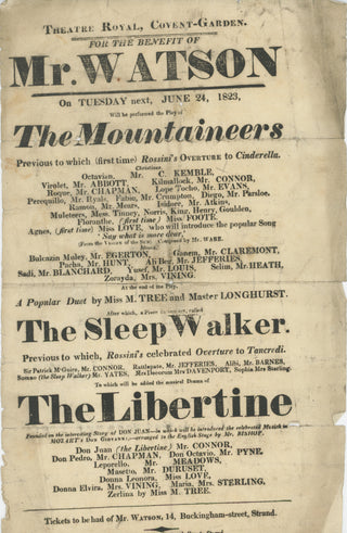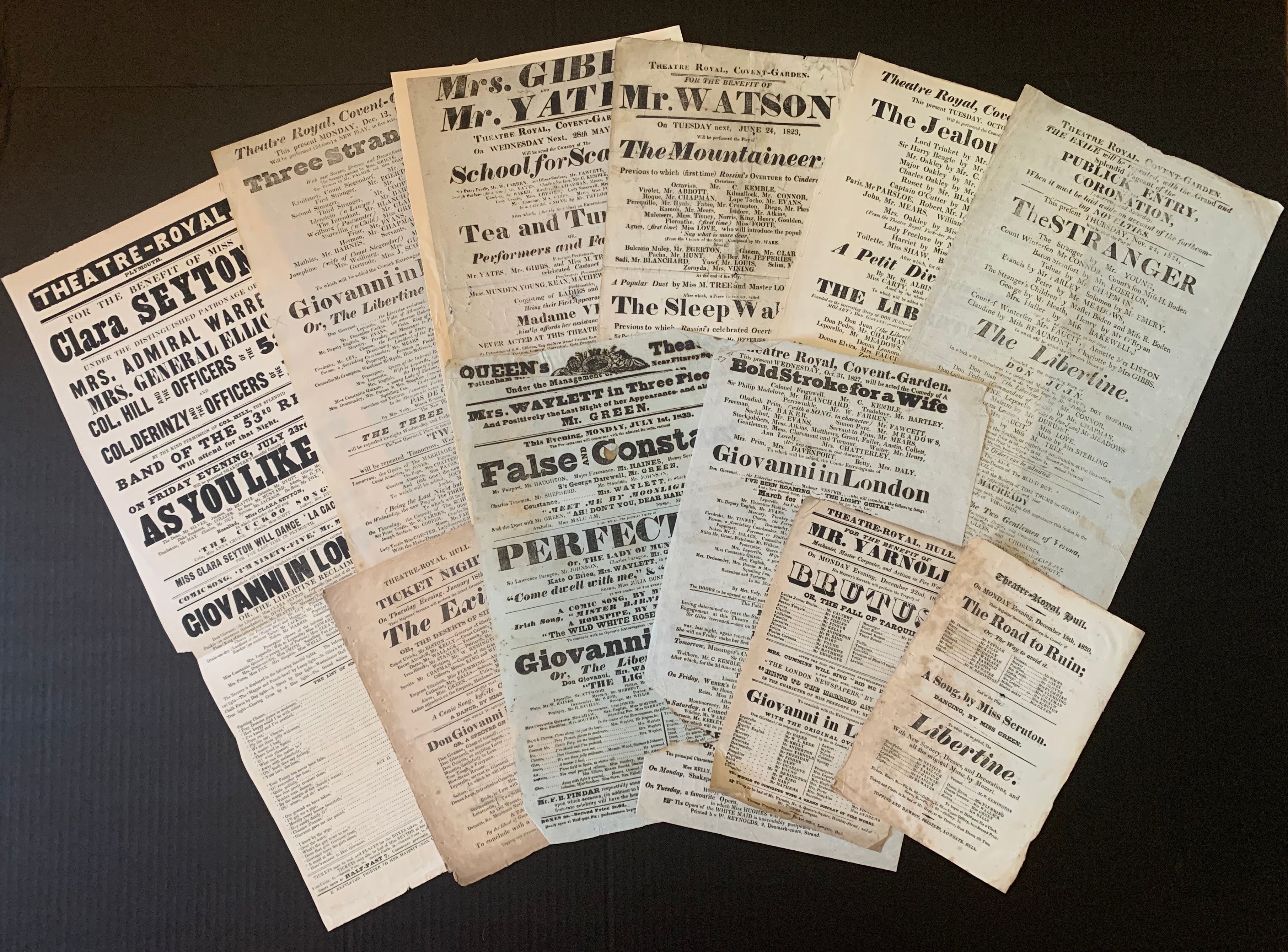 [Mozart, Wolfgang Amadeus. (1756–1791)] [Don Giovanni] Bishop, Henry. (1787–1856) & Kemble, Charles. (1775–1854). "To which will be added, 'The Libertine.' With New Scenery, Dresses, and Decorations, and all the original Music by Mozart" - Collection of London Broadsides for "The Libertine" and "Don Giovanni". Grouping of London performance broadsides ca. 1820–1840 advertising performances of The Libertine and Don Giovanni in London, primarily at Theatre Royal, Covent-Garden. Four advertise programs including The Libertine, a musical drama "arranged for the English stage" by Henry Bishop and "Founded on the interesting Story of Don Juan - in which will be introduced the celebrated Musick in Mozart's Don Giovanni," while the remaining seven announce performances of Giovanni in London, or, The Libertine Reclaimed, a play with songs adapted from Don Giovanni by William Thomas Moncrieff (1794–1857). Creases and rough edges, but overall in fine condition for their age. Seven approximately 8 x 13 inches (20.3 x 33 cm.), three 8.5 x 5.5 inches (14 x 21.6 cm.), one 7.25 x 20 inches (19 x 50.8 cm.). An intriguing group.