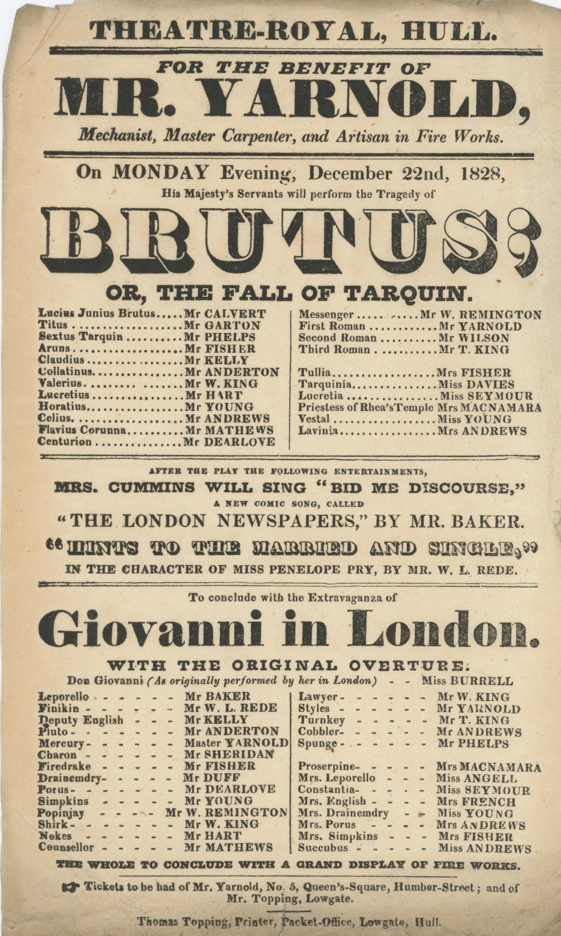 The broadsides speak eloquently to some of the different concert presentation conventions of the time. The December 1828 performance at Theatre-Royal, Hull., was presented for the benefit of Mr. Yarnold, whose listed occupations are described as "Mechanist, Master Carpenter, and Artisan in Fire Works." Sadly, no indication is given as to whether or not Mr. Yarnold was responsible for the "grand display of fire works" that was to end the evening. The July, 1833 triple-bill of shows, were all headlined by Harriet Waylett (1798–1851), a prominent English theatre performer of the day who must have had tremendous stamina. The October 1827 performance of Giovanni in London was preceded by "the Comedy of A Bold Stroke for a Wife," starring Charles Kemble, the most famous English actor of his day.