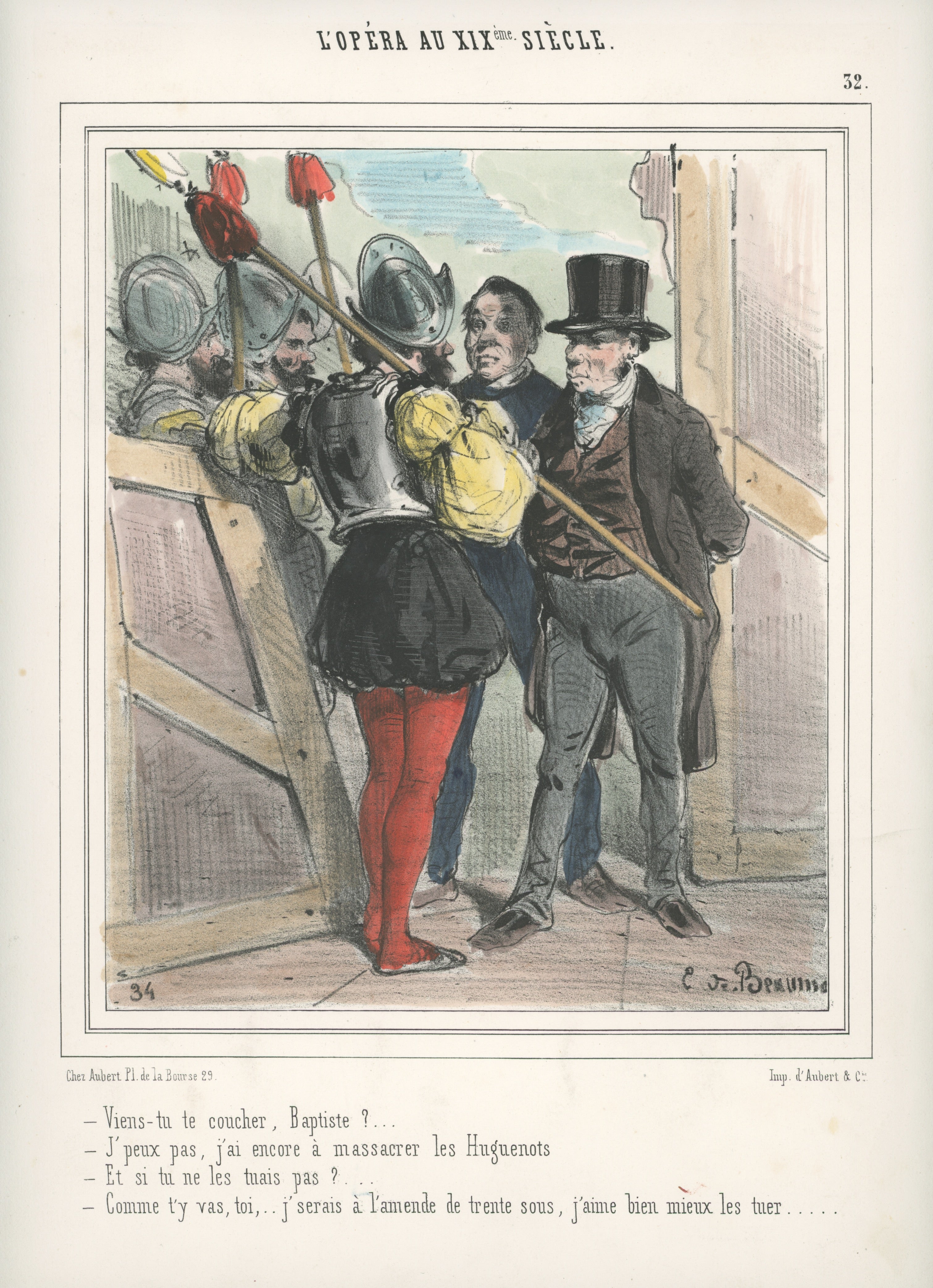 Les Huguenots, a grand opera with music by Giacomo Meyerbeer and libretto by Eugène Scribe and Émile Deschamps, debuted in Paris in 1836 to much success. The story, which culminates in the 1572 St. Bartholomew's Day Massacre of the Huguenots (Protestants) by the Catholics, concerns the romance of Raoul, a Protestant, and Valentine, a Catholic. The present print belongs to a series of around sixty caricatures entitled 'L'Opéra au XIXe siècle', initially published by the printer Aubert between 1844-1846, subsequently reprinted in 'Le Charivari.'