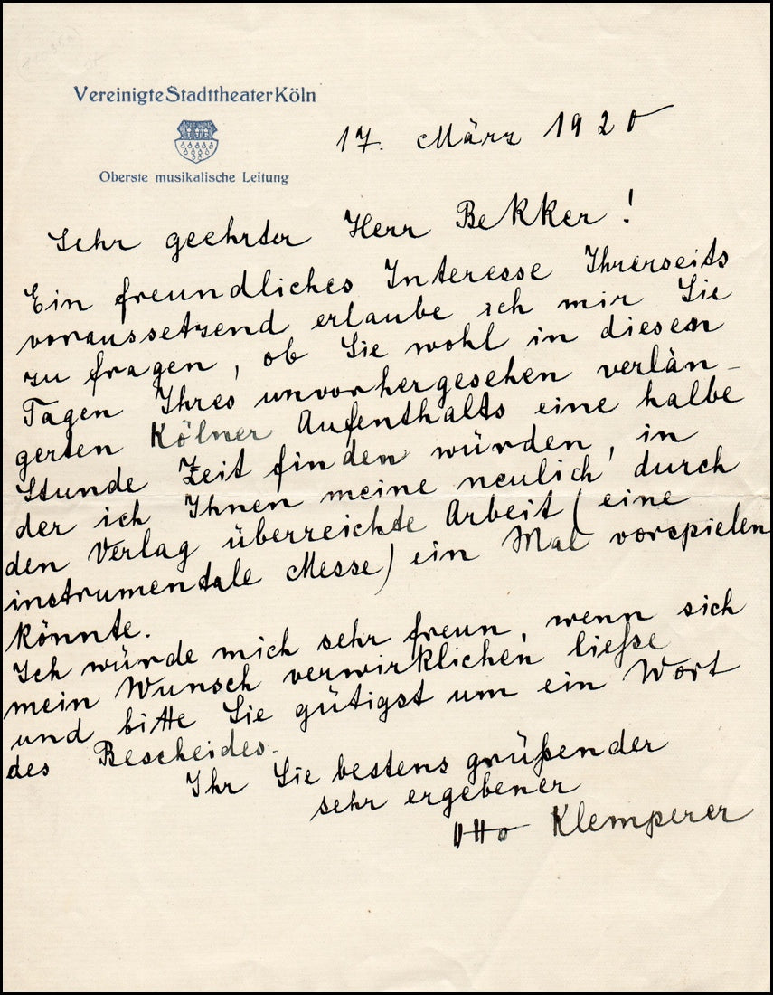 "Sehr geehrter Herr Bekker! Ein freundliches Interesse Ihrerseits voraussetzend erlaube ich mir Sie zu fragen, ob Sie wohl in diesen Tagen Ihres unvorhergesehenen verlängerten Kölner Aufenthalts eine halbe Stunde Zeit finden würden, in der ich Ihnen meine neulich durch den Verlag überreichte Arbeit [eine instrumentale Messe] ein Mal vorspielen könnte. Ich würde mich sehr freun, wenn sich mein Wunsch verwirklichen ließe und bitte Sie gütigst um ein Wort des Bescheides. Ihr Sie bestens grüßender, sehr ergebener Otto Klemperer."
