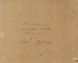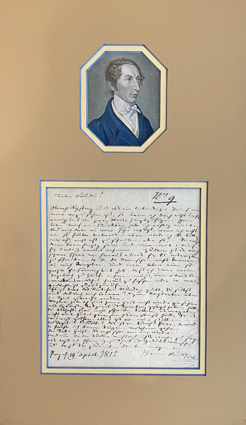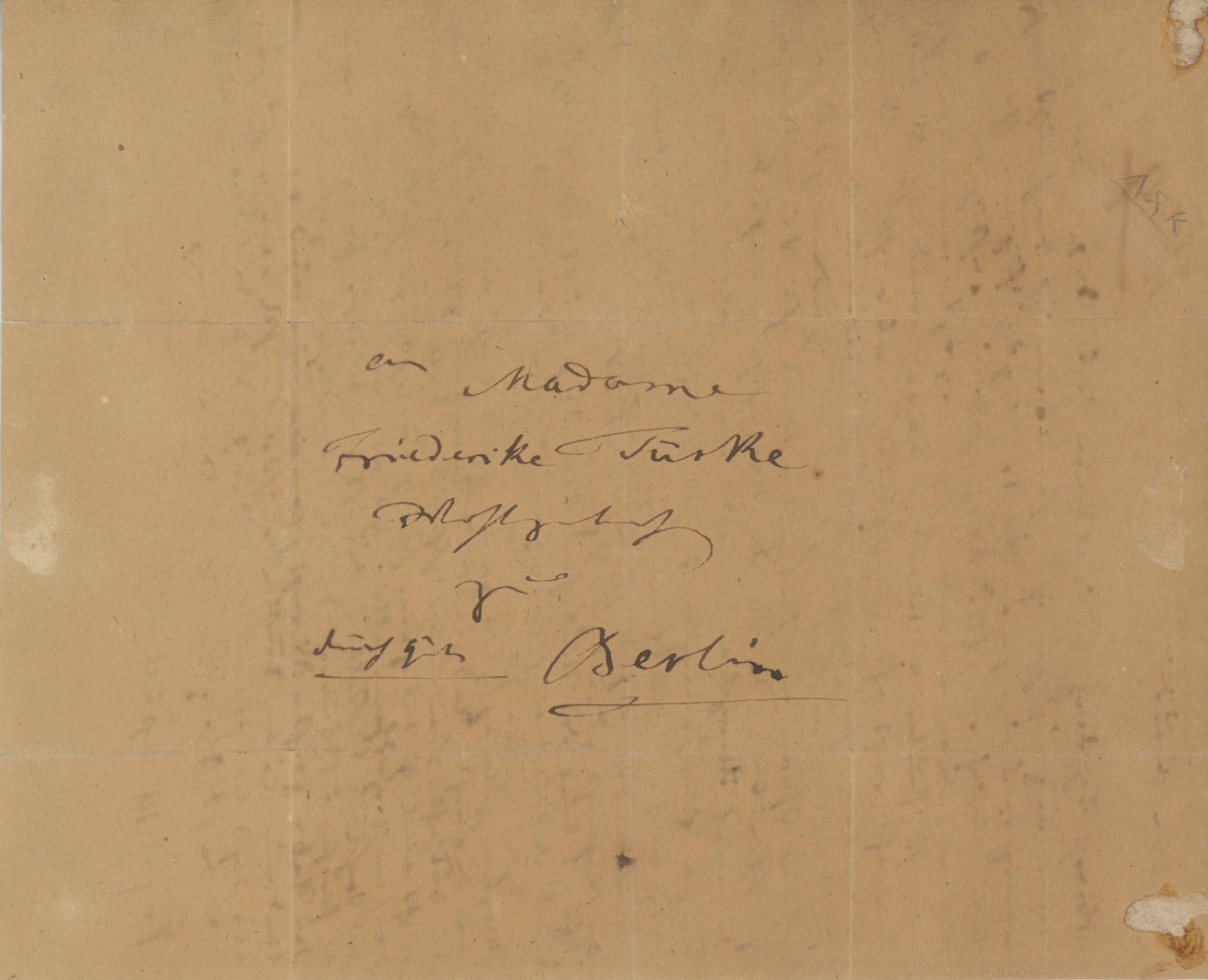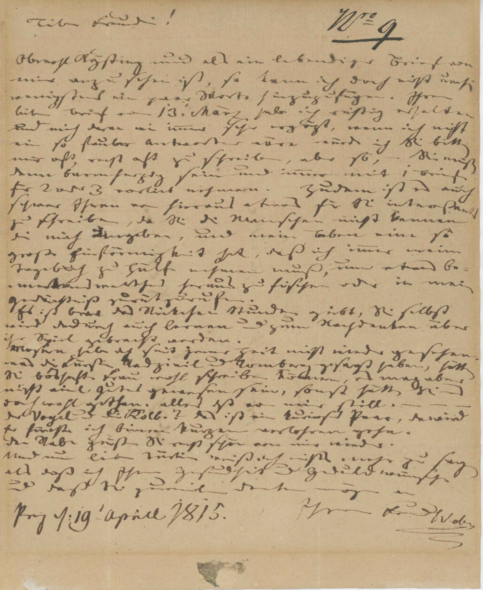 The original German text in full: "Liebe Freundin! / Obwohl Kisting als ein lebendiger Brief von mir anzusehn ist, so kann ich doch nicht umhin, wenigstens ein paar Worte hinzuzufügen. Ihren lieben Brief vom 13t. März habe ich richtig erhalten, u. mich daran, wie immer, sehr ergötzt. Wenn ich nicht ein so fauler Antworter wäre, würde ich Sie bitten, mir oft, recht oft zu schreiben; aber so – Sie müßten denn barmherzig sein u. immer mit 1 Brief für 2 oder 3 fürlieb nehmen. Zudem ist es auch schwer Ihnen von hieraus für Sie Interessantes zu schreiben, da Sie die Menschen nicht kennen, die mich umgeben, u. mein Leben eine so große Einförmigkeit hat, daß ich immer mein Tagebuch zu Hülfe nehmen muß, um etwas Bemerkenswerthes heraus zu fischen oder in mein Gedächtniß zurück zu rufen. / Es ist brav, daß Riekelchen Stunden giebt; Sie selbst wird dadurch auch lernen u. zum Nachdenken über ihr Spiel gebracht werden. / Moser habe ich seit jener Zeit nicht wieder gesehn. Was die Fürstin Radzivil u. Amberg* gesagt haben, hätten Sie boshafte Frau wohl schreiben können; es mag aber nicht viel Gutes gewesen sein, sonst hätten Sie es doch wohl gethan. Alles ist von mir still. – – – Der Vogel* u. die Kolbe? Das ist ein kurioses Paar, da wird er, fürchte ich, binnen kurzem verloren gehn. – Die Rabe* grüßen Sie recht schön von mir wieder. / Und nun, liebe Türkin, weiß ich nichts mehr zu sagen, als daß ich Ihnen Gesundheit u. Geduld wünsche, u. daß Sie zuweilen denken mögen an Ihren Freund / Weber"