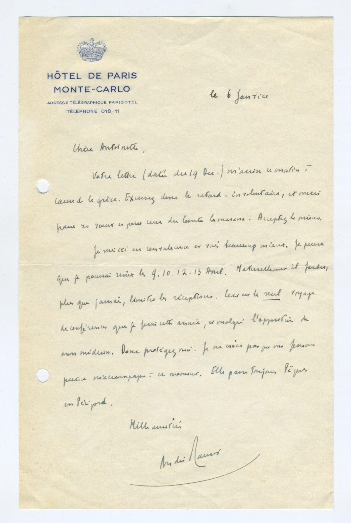 Maurois, André. (1885–1967). "I am convalescing and getting better" - Autograph Letter Signed. ALS by the prominent French biographer, novelist, and essayist to Professor Irma Antonetto who he charmingly refers to as "Antoinette". Dated 6 January with no indication of the year, but evidently concerning an invitation to speak in front of the Associazione Culturele Italiana. 1 pp., on Hôtel de Paris Monte-Carlo stationary. Translated from the French: "Your letter (dated to 19 December) reached me this morning, on account of the strike. Sorry for the delay – involuntary, and thank you for your wishes and those of Conte Lamerana. Please accept mine. I am in convalescence and getting better. I think that I should be able to come on April 9, 10, 12, and 13. Naturally it is necessary, more than ever, to limit visits. This is the only conference I will attend this year, and despite my doctor's protestations. So protect me. I don't think my wife will be able to come with me at that time. She always spends Easter in Périgord. A thousand pleasantries." Mailing folds, else fine, 5.25 x 8.25 inches (13.3 x 21 cm.).