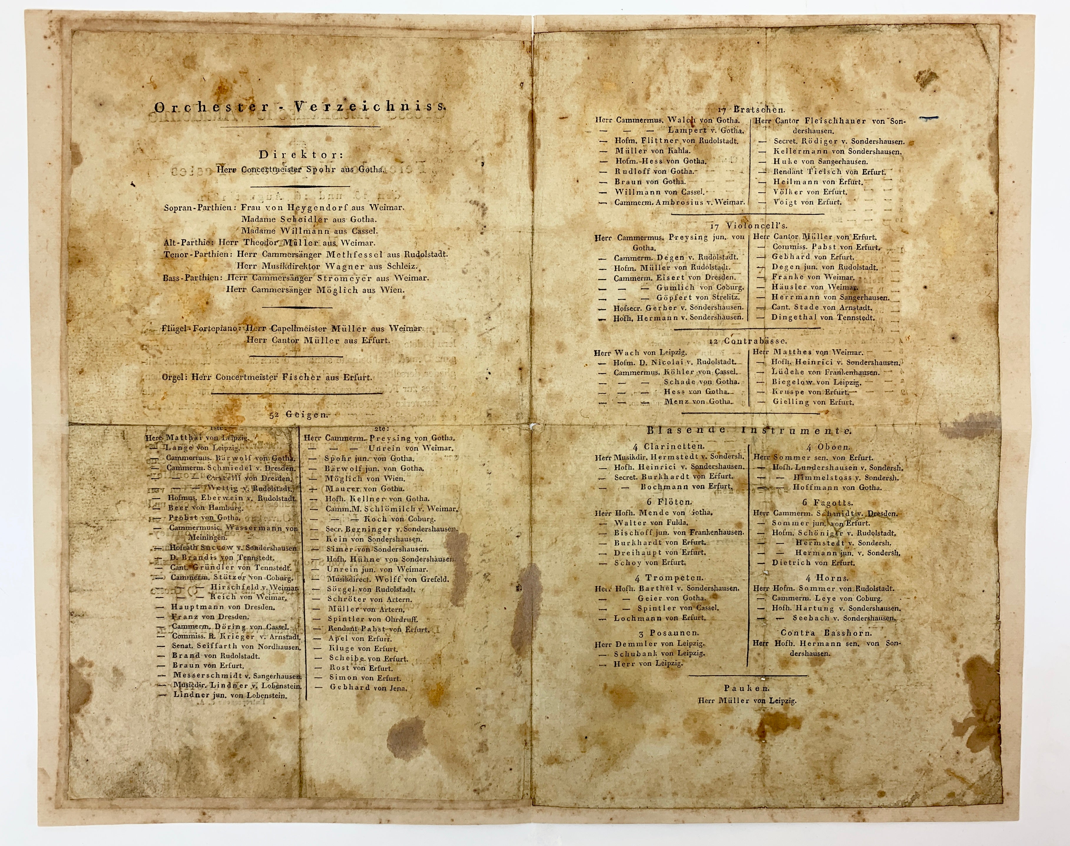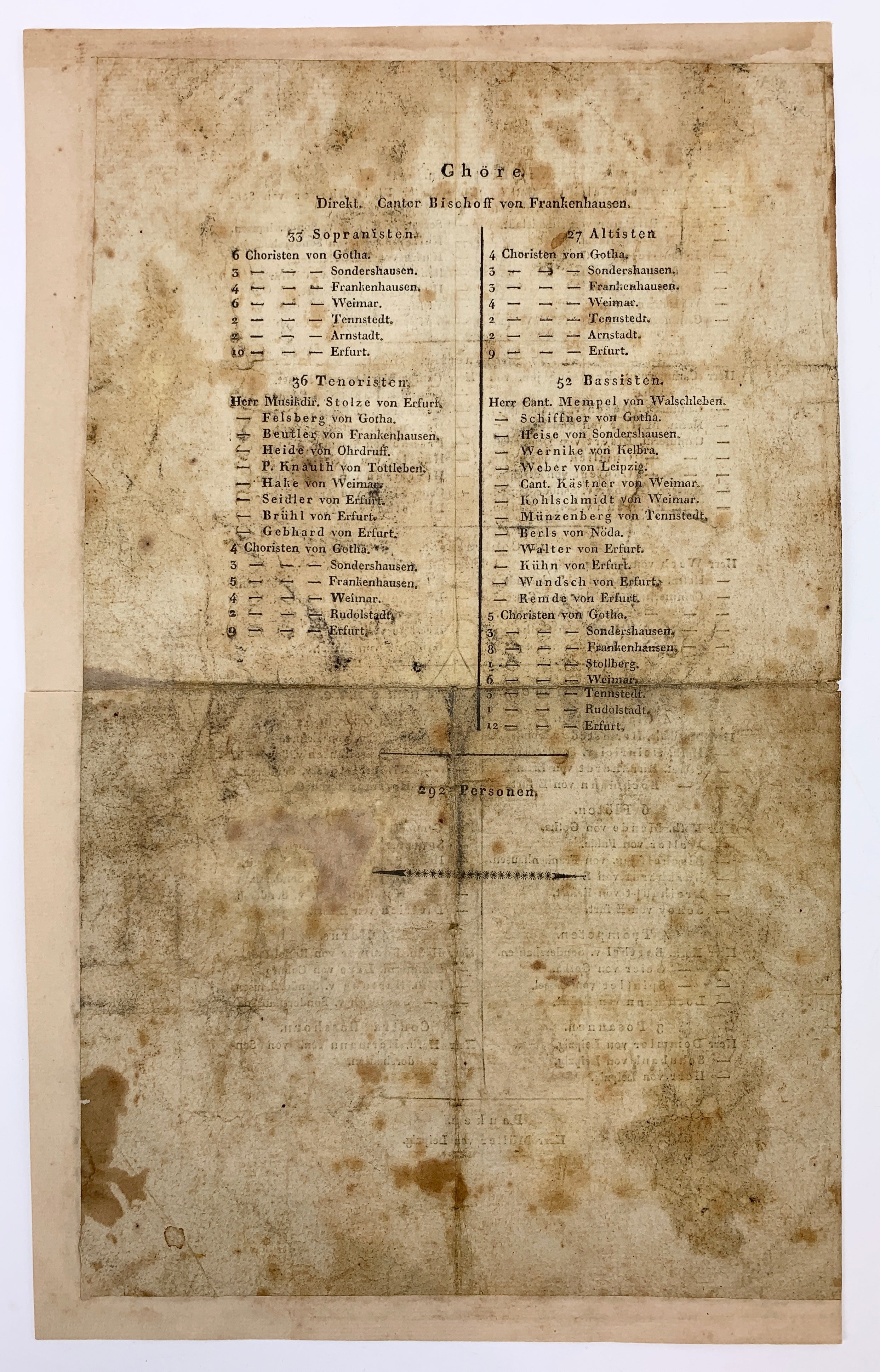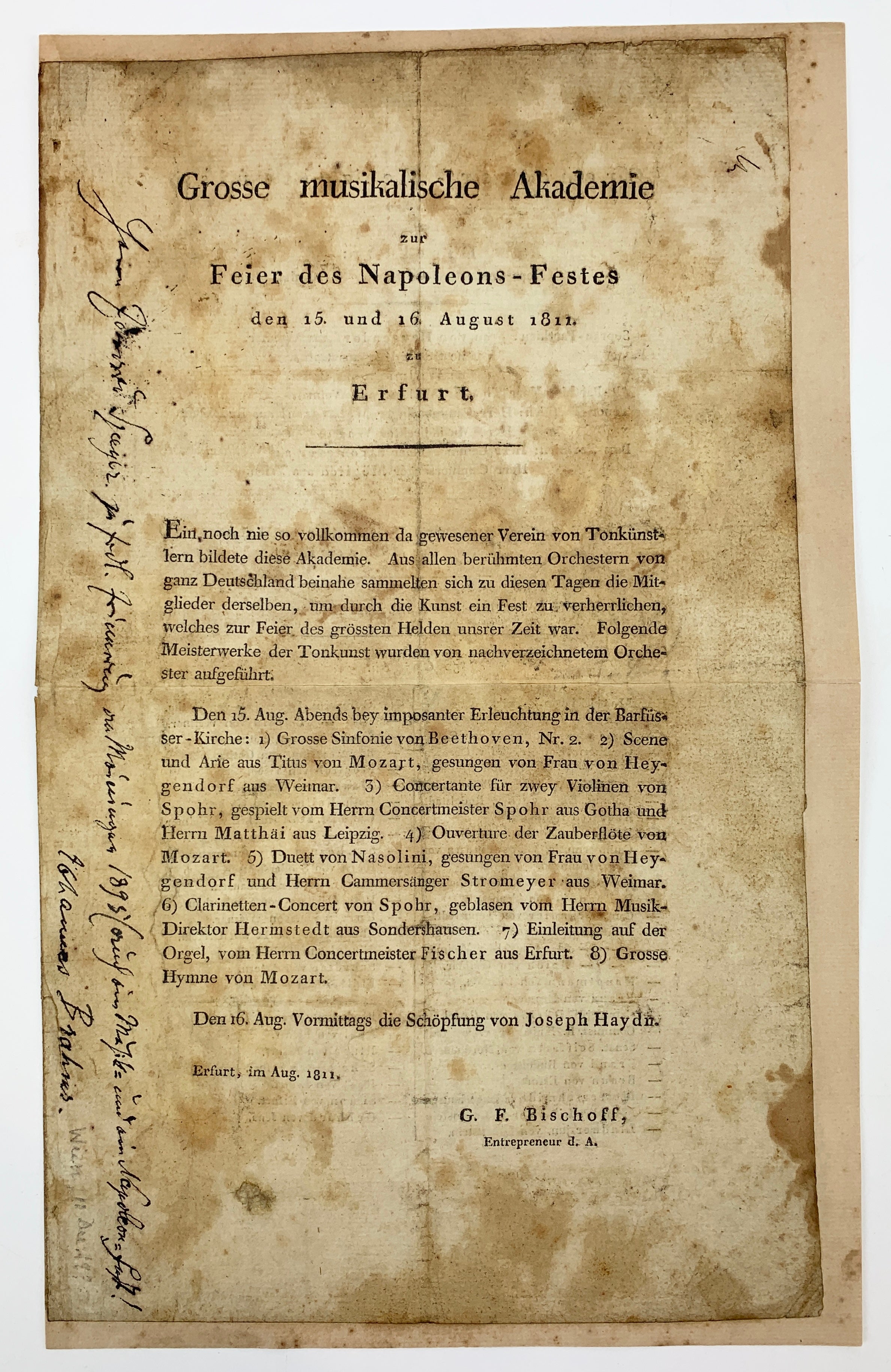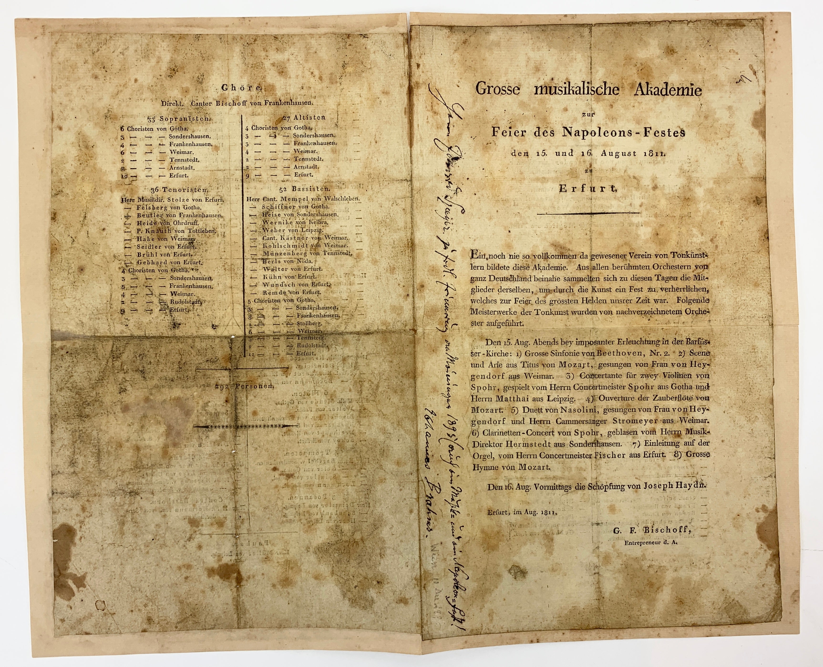 The Principality of Erfurt was a small state in modern Thuringia, Germany, that existed from 1807 to 1814, comprising the modern city of Erfurt and the surrounding land. Subordinate directly to Napoleon, rather than being a part of the Confederation of the Rhine, it was the site in 1811 of extravagant celebrations of Napoleon's birthday. The musical performances of the Napoleon festival of 1811 in Erfurt, under the direction of Louis Spohr, assembled choral and instrumental performing forces of a scale previously unseen and unheard in musical history. The present announcement lists 292 individuals, including an orchestra of 131 and a choir of 148 performers, and a program of music by Beethoven (an early performance of the 2nd symphony), Mozart, Spohr, Nasolini, and Fischer. Introductory text provided by Georg Friedrich Bischoff (1780–1841).
