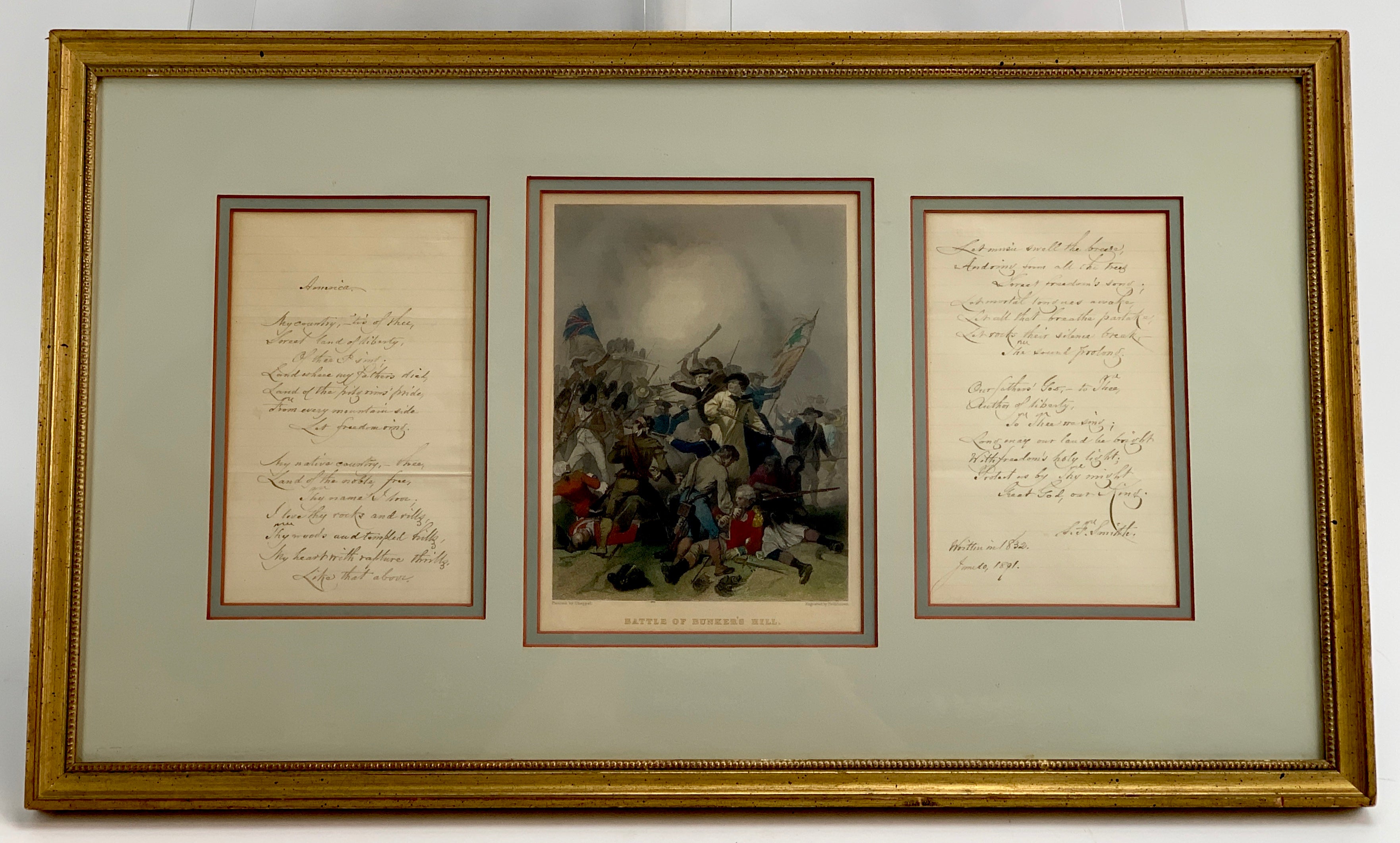 Smith, Samuel Francis. (1808-1895). "My Country Tis of Thee," Autograph Signed Quotation. Autograph quotation of one of America's most famous anthems, penned and signed by the author, on two lightly lined off-white approximately 5 x 7.5 inch sheets, signed at the conclusion “S. F. Smith, Written in 1832. / June 10, 1891.” Smith pens all four stanzas of “America.” In part: “My country, ’tis of thee,/Sweet land of liberty,/Of thee I sing;/Land where my fathers died,/Land of the pilgrims’ pride,/From every mountainside,/Let freedom ring…. Our father’s God to Thee,/Author of liberty,/To Thee we sing./Long may our land be bright,/with freedom’s holy light,/Protect us by Thy might,/Great God our King.” Matted and framed with a hand colored steel engraving of the Battle of Bunker's Hill (Phillibrown, after Chappel, published 1859) to an overall size of 24 x 18. Unexamined out of the original Charles Hamilton frame, but in apparently fine condition with light toning and the writing clear and distinct throughout. Examples of this classic of collectible Americana including all four stanzas have become quite elusive.