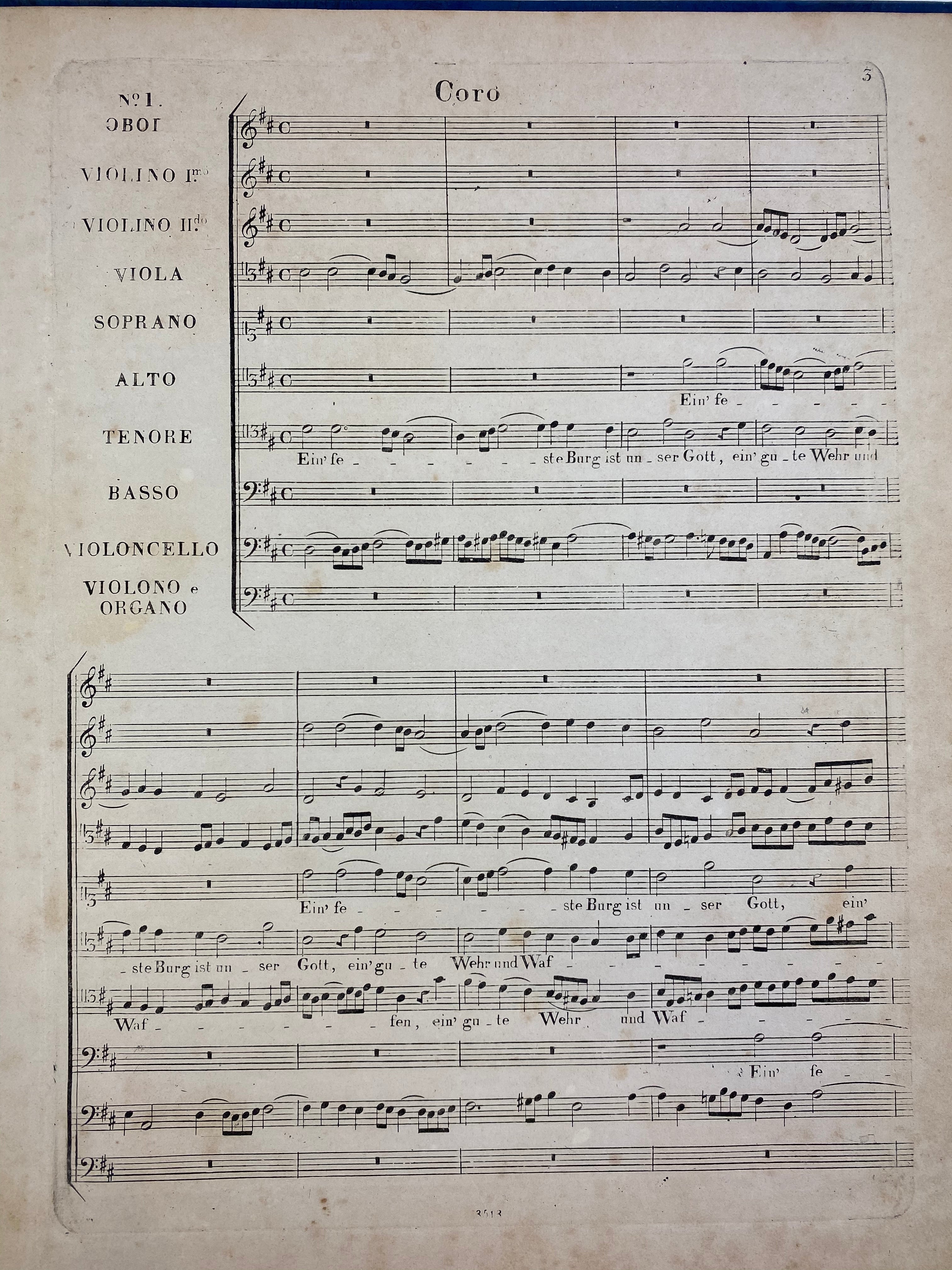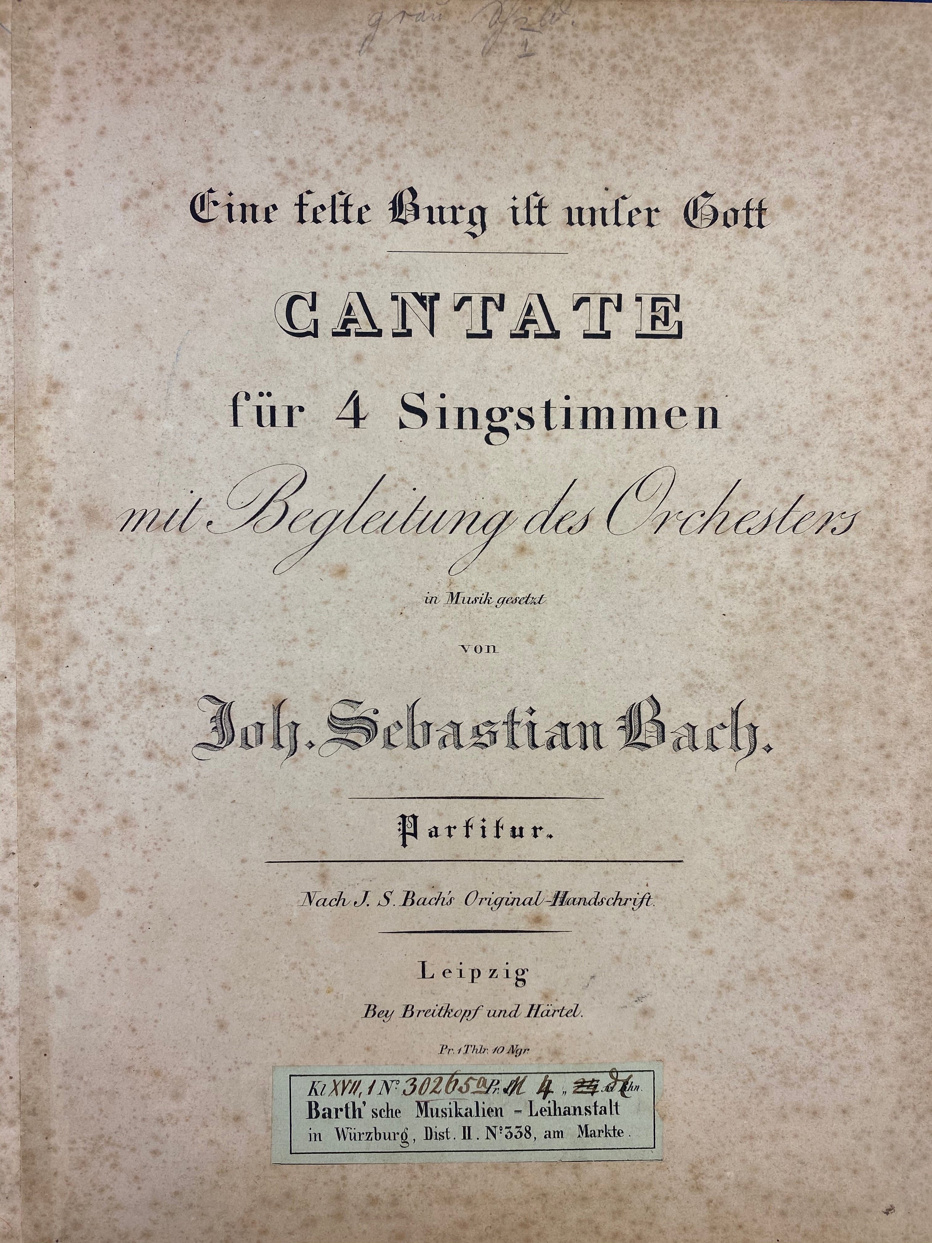 Composed for the Feast of the Reformation, celebrated annually on October 31, this is arguably the best known of all of Bach’s cantatas. Employing the most famous of all Lutheran chorales, “Ein feste Burg ist unser Gott” (A might fortress is our God), a chorale written by Luther himself, Bach’s congregation at Thomaskirche would definitely have known this melody by heart. First performed between 1727 and 1731, it was probably composed either in 1723 or between 1728 and 1731. It is based on the earlier cantata Alles, was von Gott geboren, which was produced in Weimar in 1715 or 1716 for the fourth Sunday after Easter. This was also the first of Bach's cantatas to be published after his death. The Bach Gesellschaft edition did note appear until half a century later, and included an extended instrumentation by Wilhelm Friedemann. Extremely rare, we have traced only one copy appearing at auction, in 1953. Worldcat records 5 copies, all in Germany.