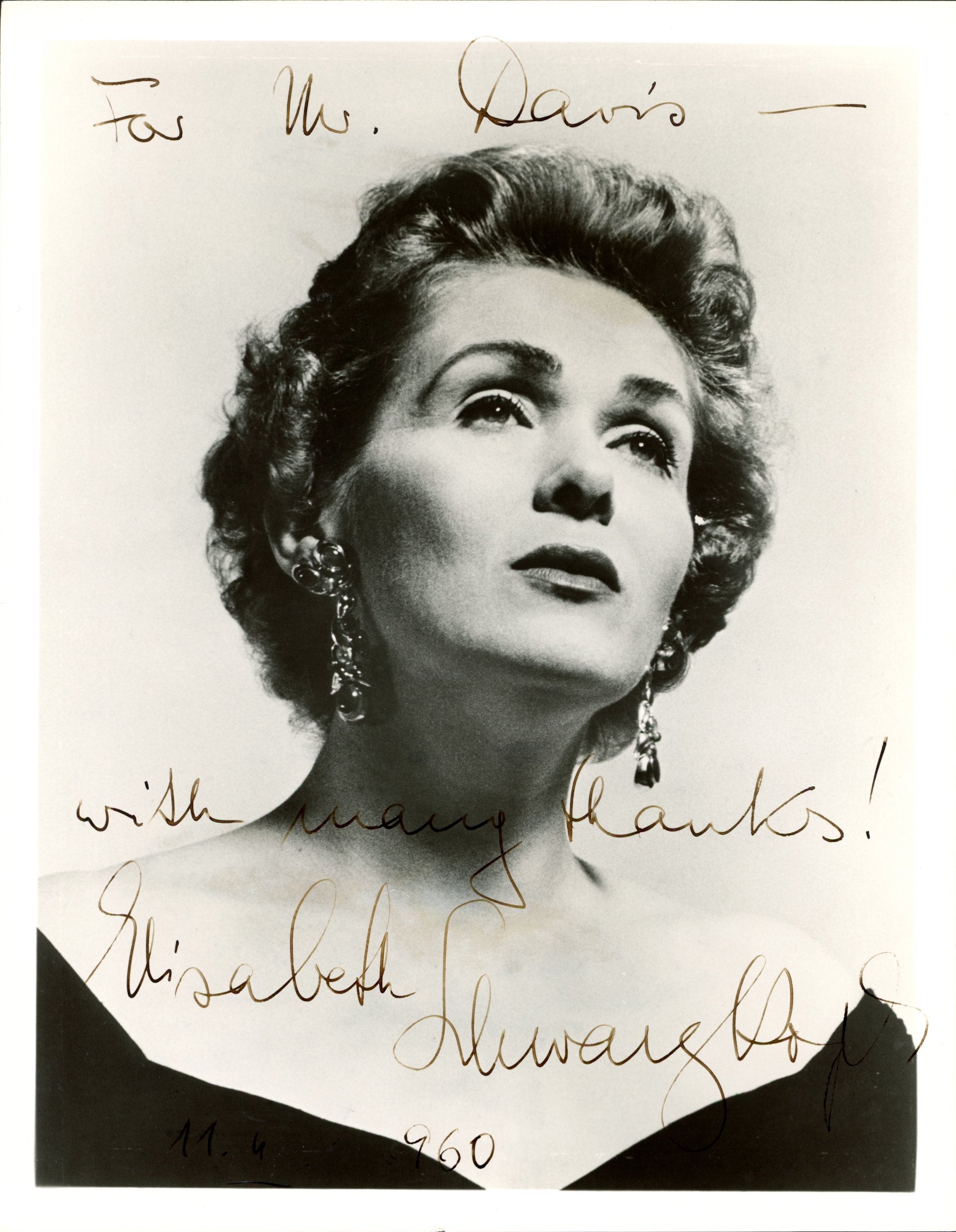 Schwarzkopf, Elisabeth. (1915–2006). Signed Photograph. Signed photograph of the great soprano, who has inscribed "For Mr. Davis— with many thanks! / Elisabeth Schwarzkopf / 11.II.1960." Small dent to lower edge, stains and surface loss to verso with slight show-through to recto, else in very fine condition. 8 x 10 inches (20.32 x 25.4 cm.).