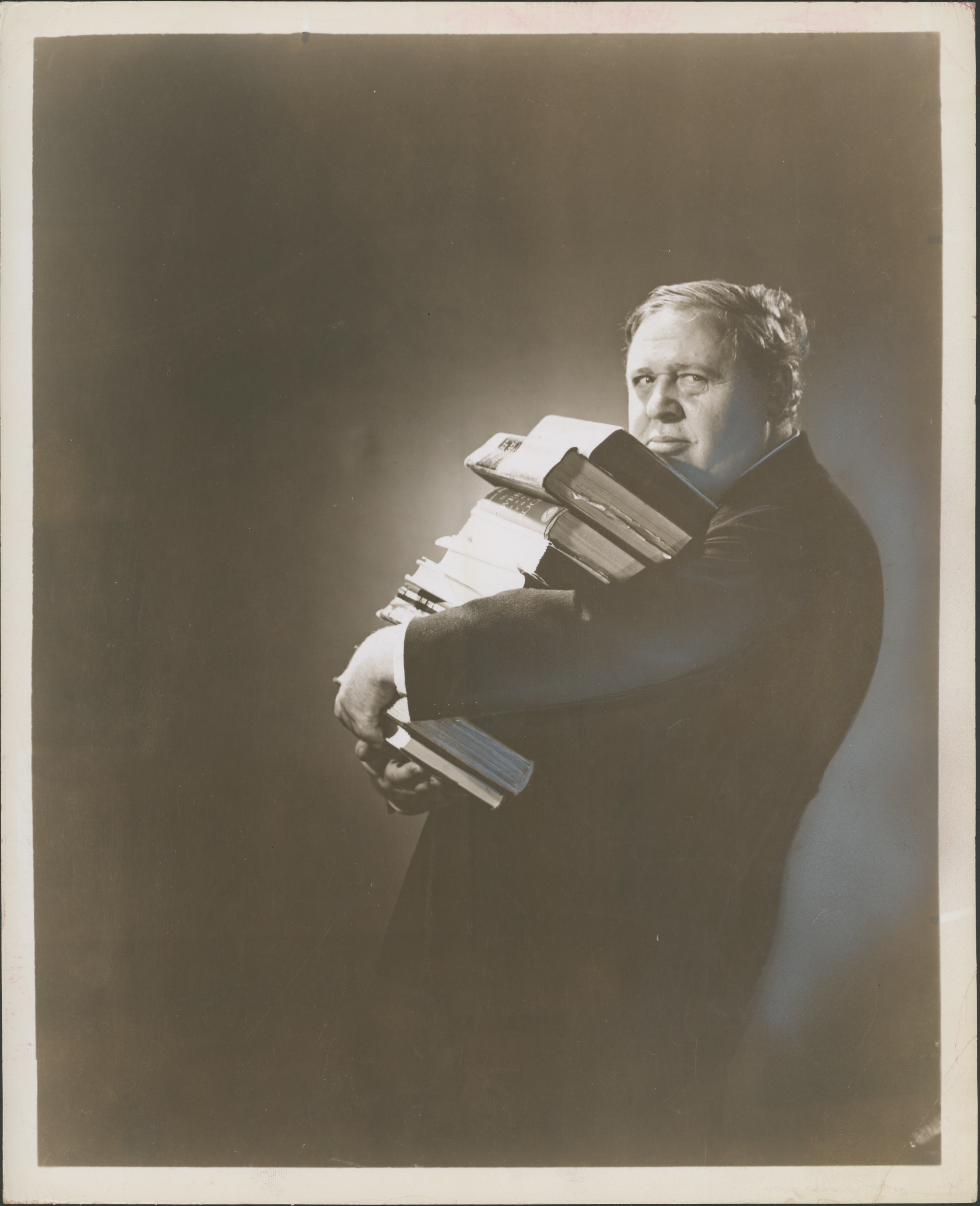 [Books!] Laughton, Charles. (1899–1962). Original Photograph . Press photograph of the English stage and film actor, a mischievous look upon his face as he carries a sizable stack of books. Pencil markings to verso indicate the image was used in the Music section of a Sunday, December 3, 1950 newspaper, the words "Charles Laughton to perform tonight" written to the upper edge. White in-painting for contrast in later printing along right side, creases to lower right corner, moderate edgewear, overall in fine condition. 8 x 10 inch (20.3 x 25.4 cm.).