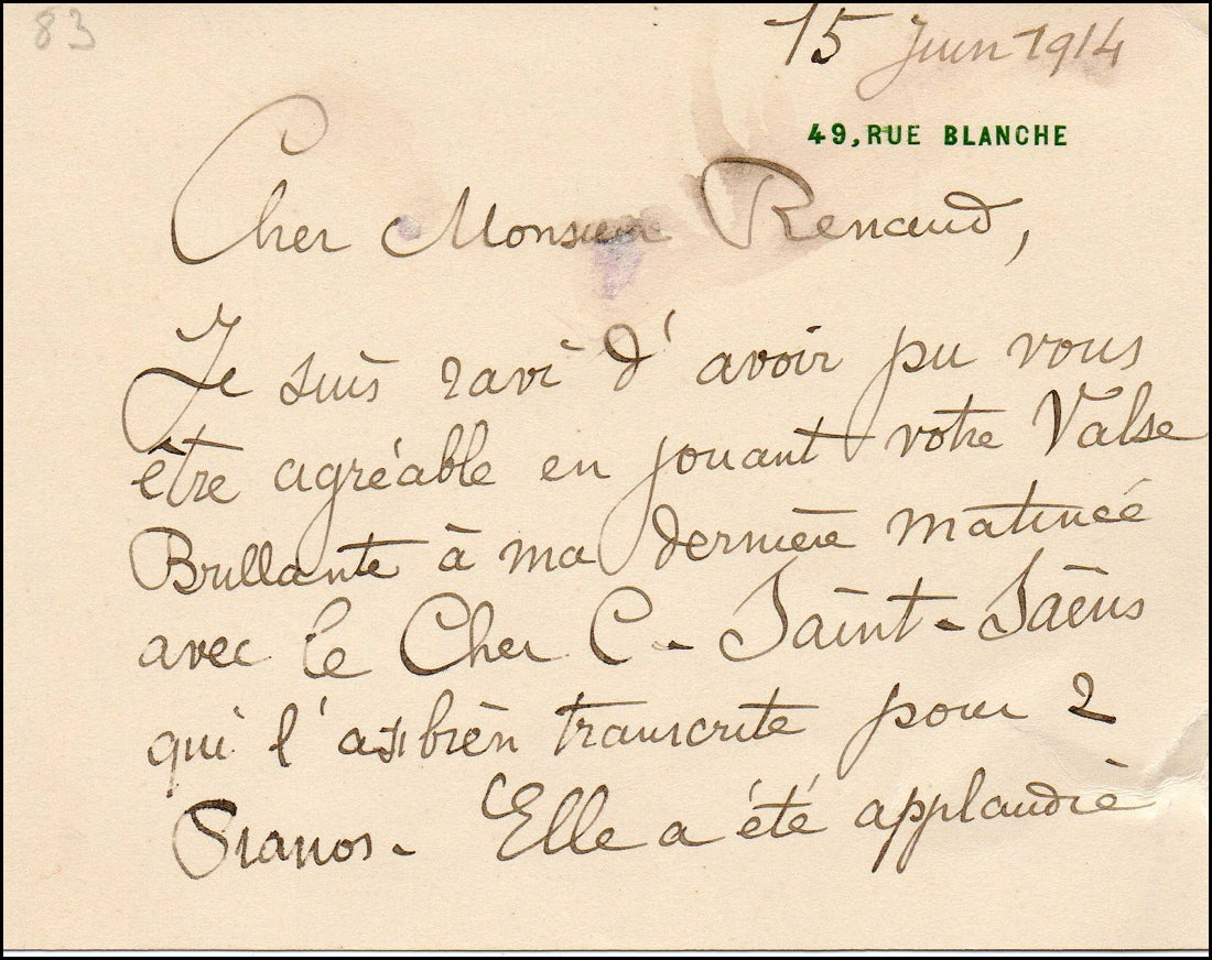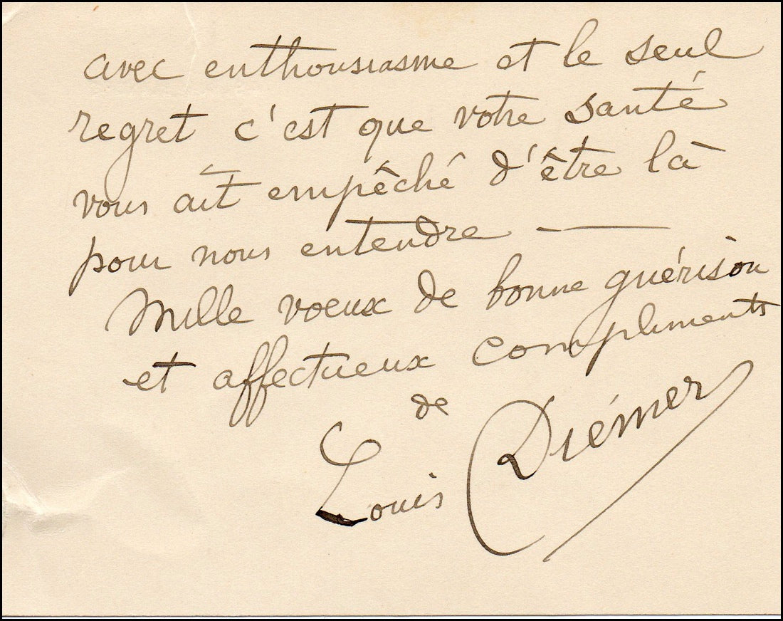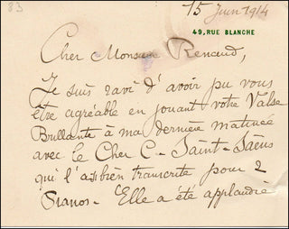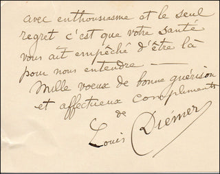 Diémer, Louis-Joseph. (1843-1919). ALS to Renaud, mentioning Saint-Saens. Autograph Letter to Emile Renaud (organist of the palace chapel, Versailles), relating his pleasure at performing Renaud's "Valse Brillante" at his recent mantinée concert with C. Saint-Saens who had transcribed it for 2 pianos. On both sides of a small card, boldly signed by the great French pianist and composer.