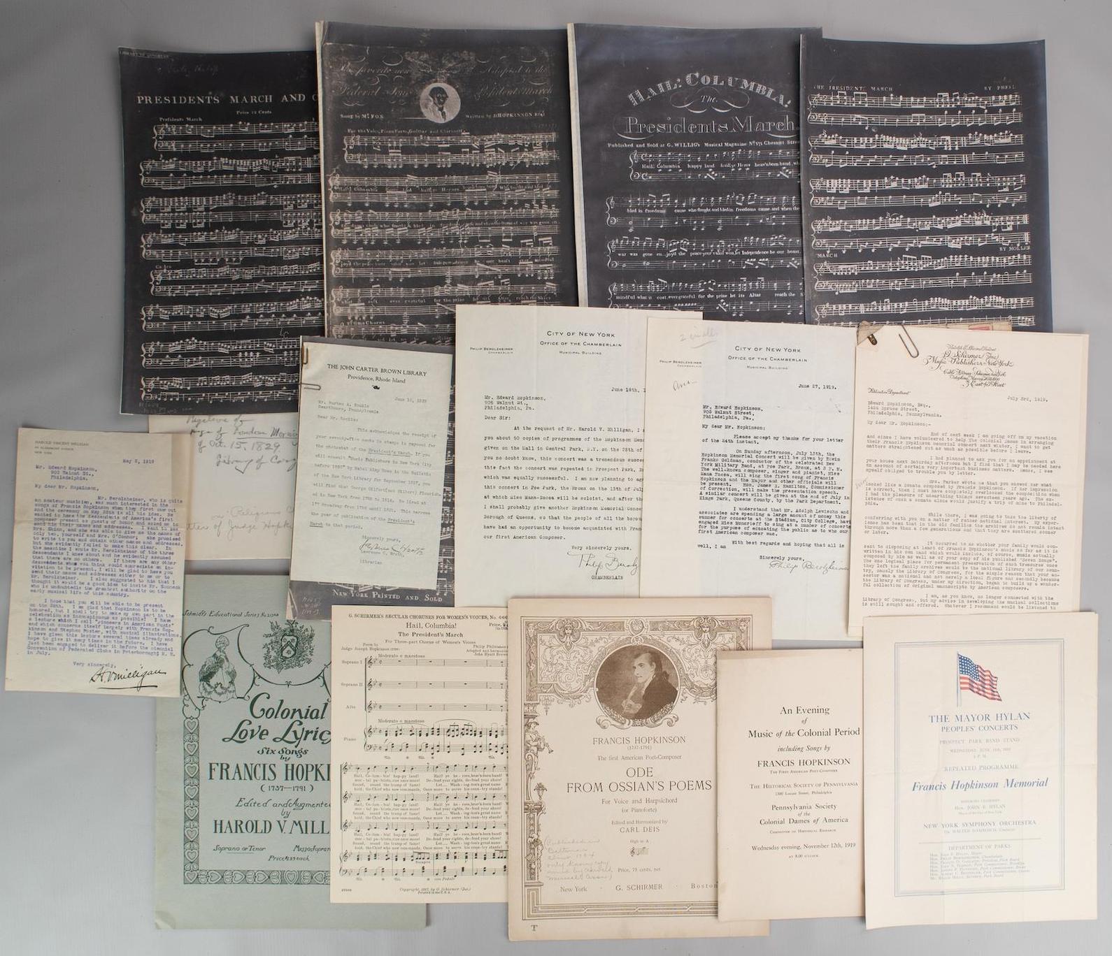 Grouping of sheet music, typed letters signed and programs related to "our first American Composer," all from the Francis Hopkinson Family Archives.